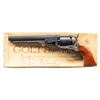 Cal. 36. S# 25892. Standard configuration 7.5" octagonal barrel, blue & case colors, one line Colt New York City address, rolled naval battle cylinder scene, varnished walnut grips, housed in illustrated "COLT'S 1851 NAVY" cardboard box. CONDITION: revolver retains most all bright blue and case colored finish, box is labeled for different S# gun. (01-28707/JS). ANTIQUE. $400-600.