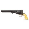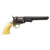 Cal. 36. S# 17431. Bbl. 7 1/2" with bead front sight. Top flat has added Sam Colt New York City address. 6-shot rnd. cyl. with naval scene roll engraving. Large brass trigger guard and back strap. 1-piece artificially aged natural white replacement grip. CONDITION: 70% lightly faded added browned finish showing edge and carry wear. Cyl. has lightly worn scene. Grips have poor fit to frame. Functioning action. Bore and cyl. chambers show some pitting. (01-27897/DS). ANTIQUE. $250-400.