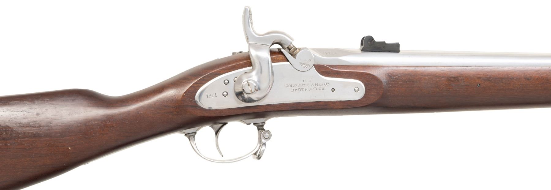 Cal. 58. S# 4126. Colt 1995 "Signature Series" Civil War reproduction rifled musket, 1861 dated lock & barrel, 3 clamping barrel bands, 3-position blued rear sight, bright steel finish. CONDITION: fine, retains most of its bright finish, mechanics fine, bright shiny bore. (01-28290/JS). ANTIQUE. $500-800.