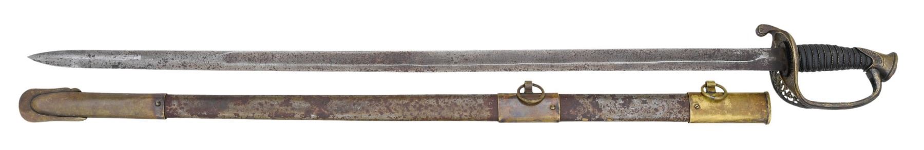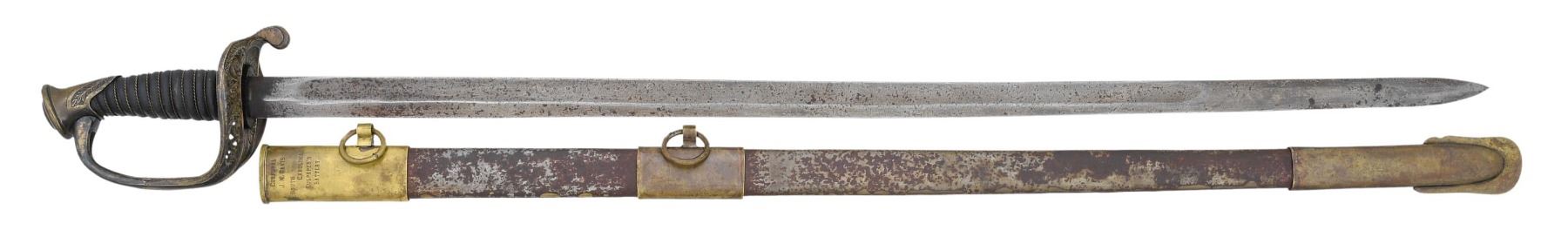 A high quality reproduction Confederate Foot officer's sword originally produced by Leech & Rigdon of Memphis, Tennessee. The sword measures 38 5/8" overall and has a blade length of 32 1/8". The plain blade has a single wide unstopped fuller and is unmarked. Brass hilt with pierced foliate decorated guard and a "CS" in oval on the inner top of the guard. Laurel leaves decorate the pommel. Wire wrapped leather grip. Iron bodied scabbard with brass mounts. The top mount is engraved "CORPORAL J. N. DAVIS SOUTH CAROLINA CULPEPPER'S BATTERY". CONDITION: blade has a mottled gray patina with scattered light staining. Hit has a dark mustard patina and the grip shows little wear with no losses. The scabbard has a mottled patina on the iron and a rich mustard patina on the brass. (02-24818/BF). NON-GUN. $400-600.