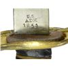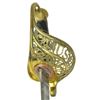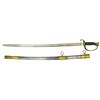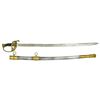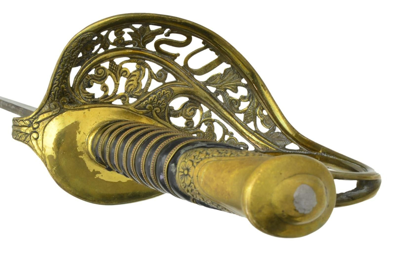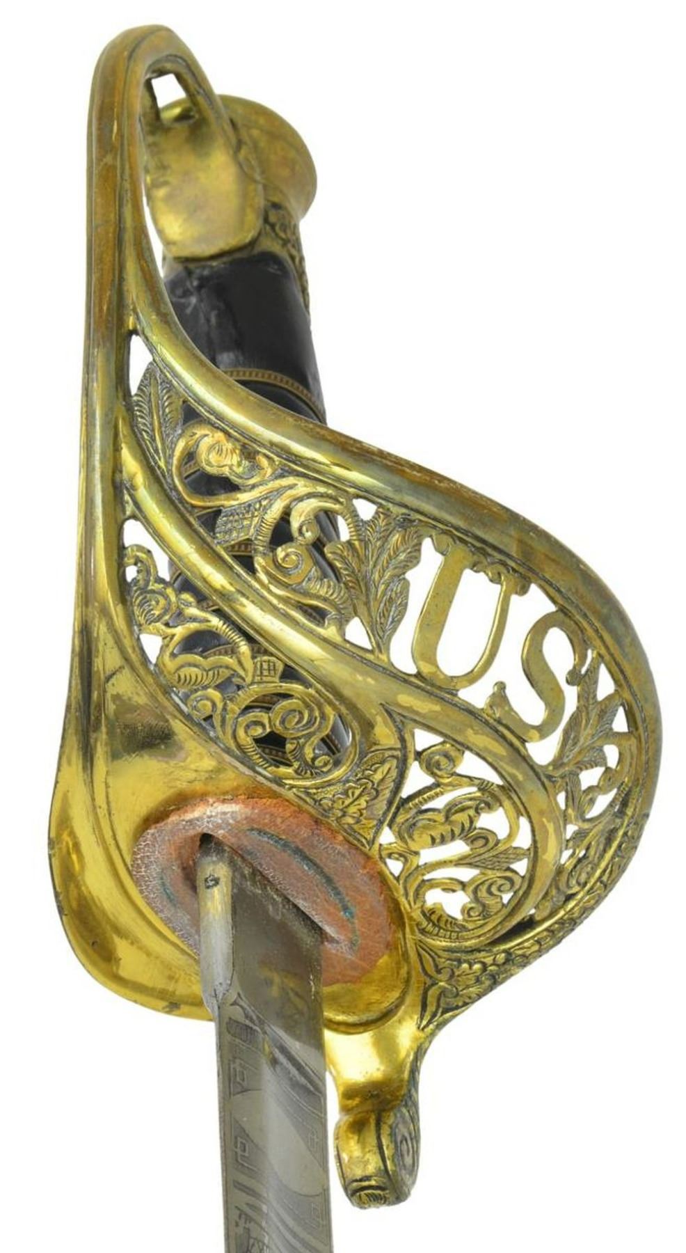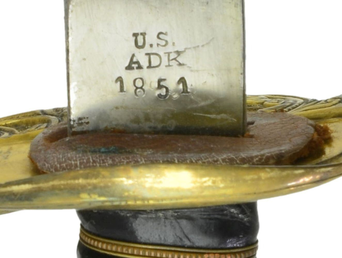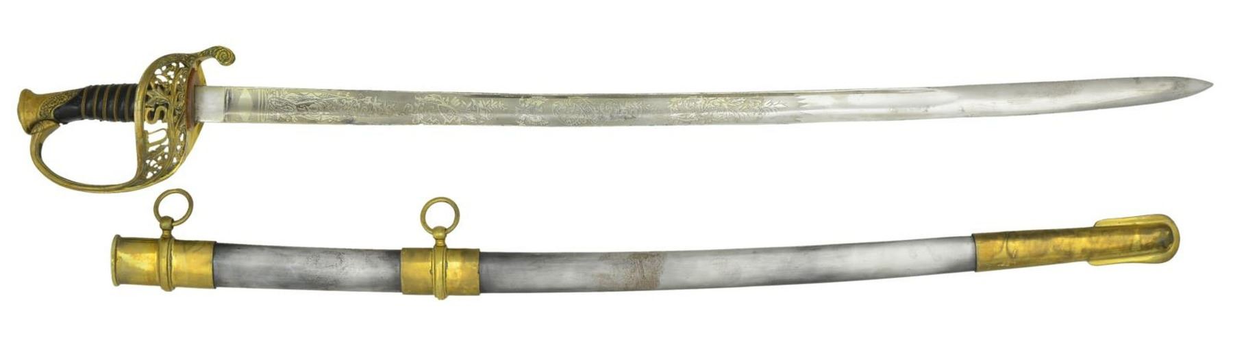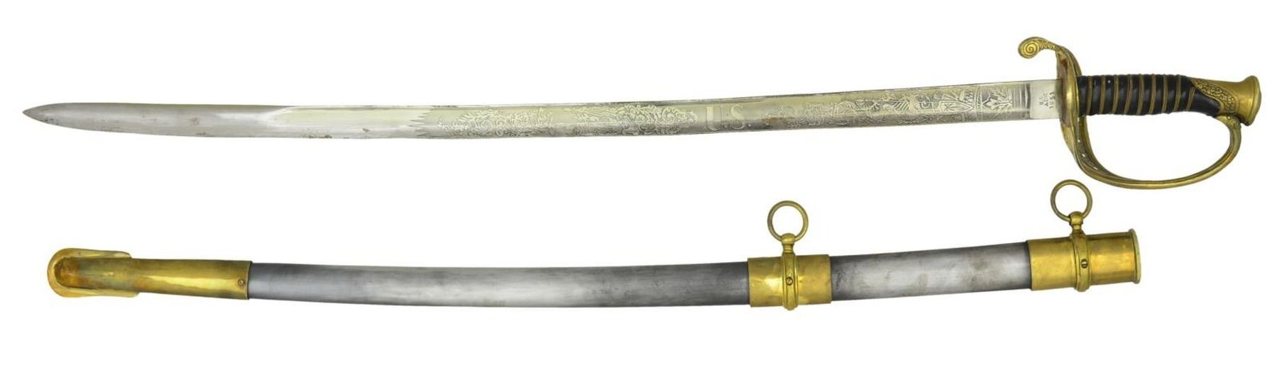 SWORD. Overall length: 38 1/2". Blade length: 30 3/4". The blade has a single wide fuller and a secondary fuller near the spine. The blade is etched over 17” with various foliate, patriotic, and military motifs. The ricasso has a spurious stamp that reads “U.S. ADK 1851.” Gilded brass hilt. Wire-wrapped leather grip. Gilded brass-mounted iron scabbard. CONDITION: blade has a light gray overall patina. Hilt has approx. 70% of the finish remaining. The grip is undamaged. Scabbard has had the finish removed from the body. (02-21839/BF). $100-200.