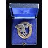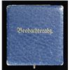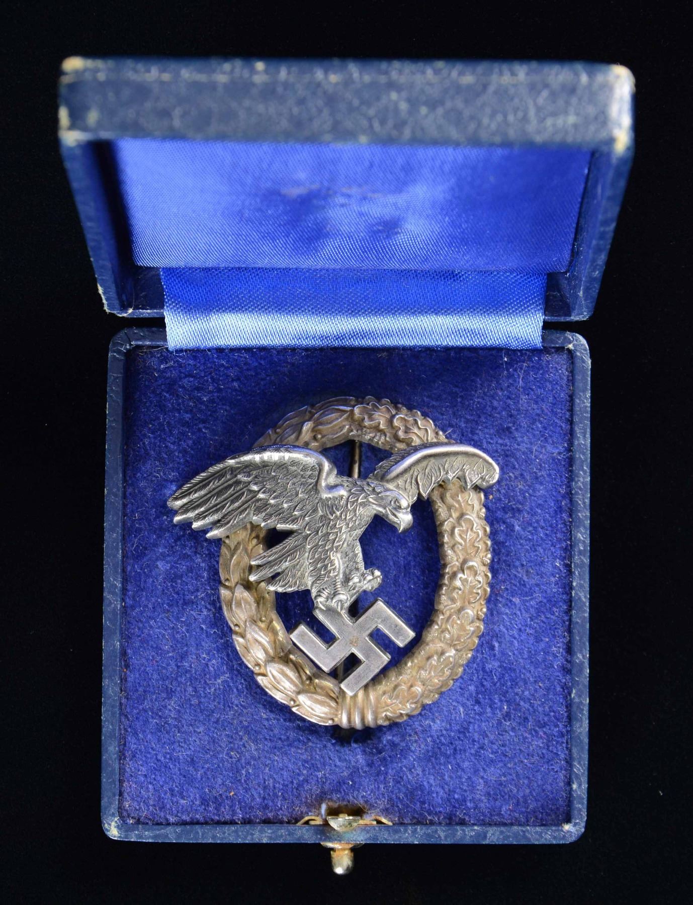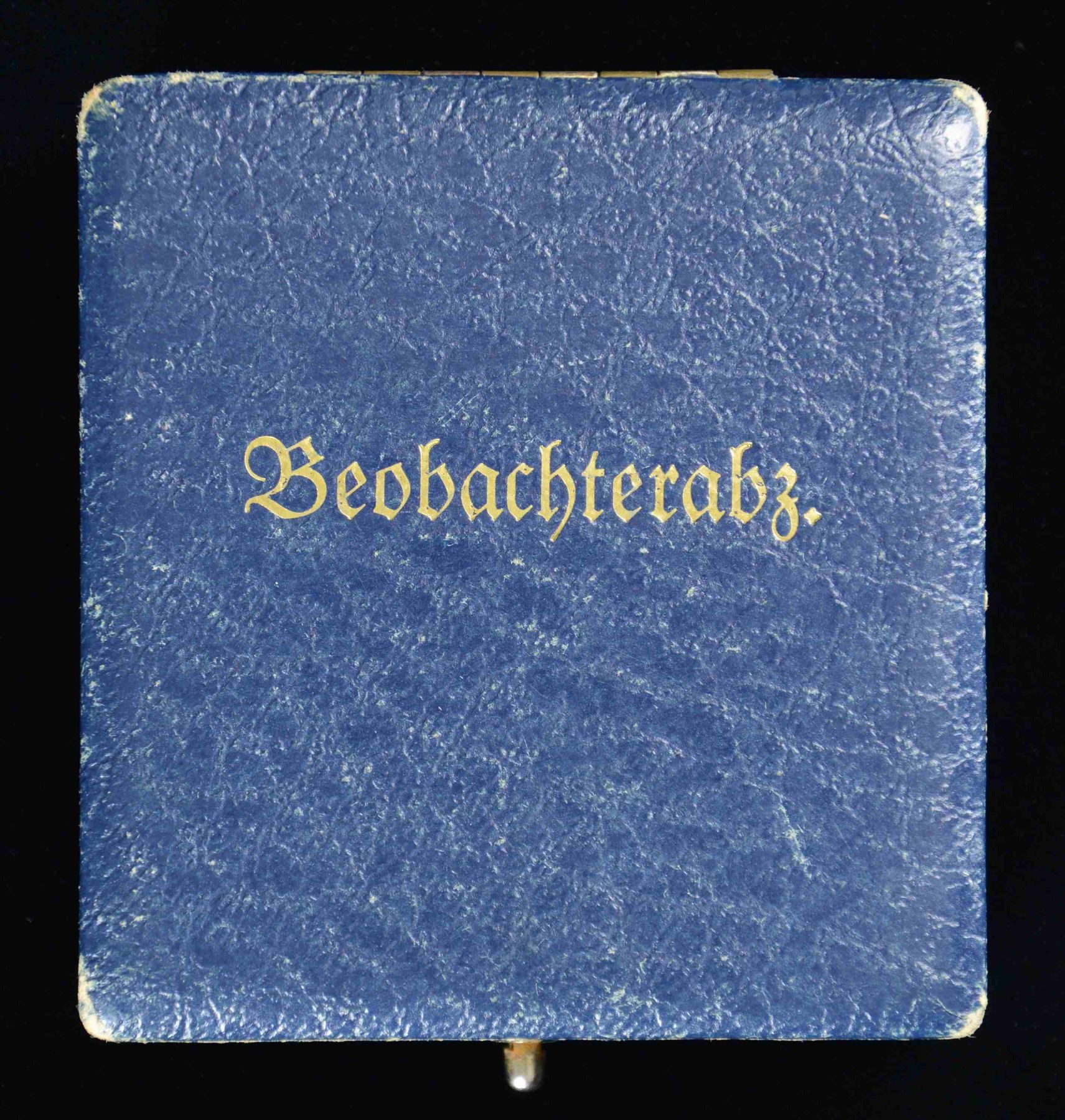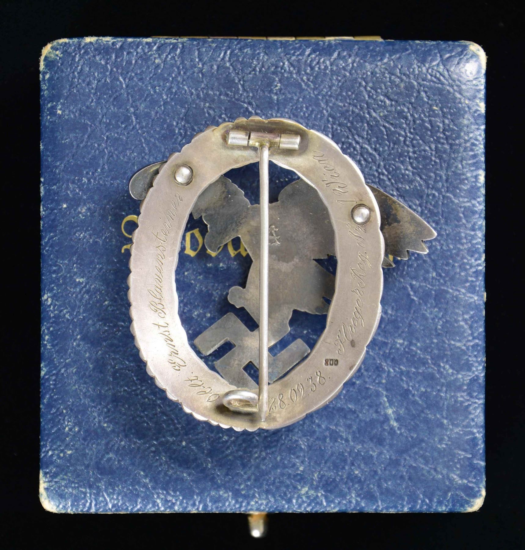 OBSERVER'S BADGE. This badge features a flying eagle grasping a party symbol superimposed over an oak leaf and laurel leaf wreath. The back of the eagle has a stylized "A" for Assman. The eagle is attached by two rivets, and the wreath is stamped "800". The wreath is professionally hand-engraved "Oblt. Ernst Blavensteiner 28.09.38. Fleiger Reg. Nr. 1 Wien". The original case has a dark blue, textured finish and is embossed "Beobachterabz" in gold on the lid. The interior has blue velvet with a blue silk-like pillow. This badge is exceptionally well made; however, we feel, due to variations in manufacturing style and techniques not generally seen in Assman products, that this badge and its case are high-quality reproductions. CONDITION: badge shows expected wear both on the front and reverse. Case shows light to moderate wear with loss of finish at the corners. (02-23295-6/BF). NON-GUN. $50-100.