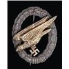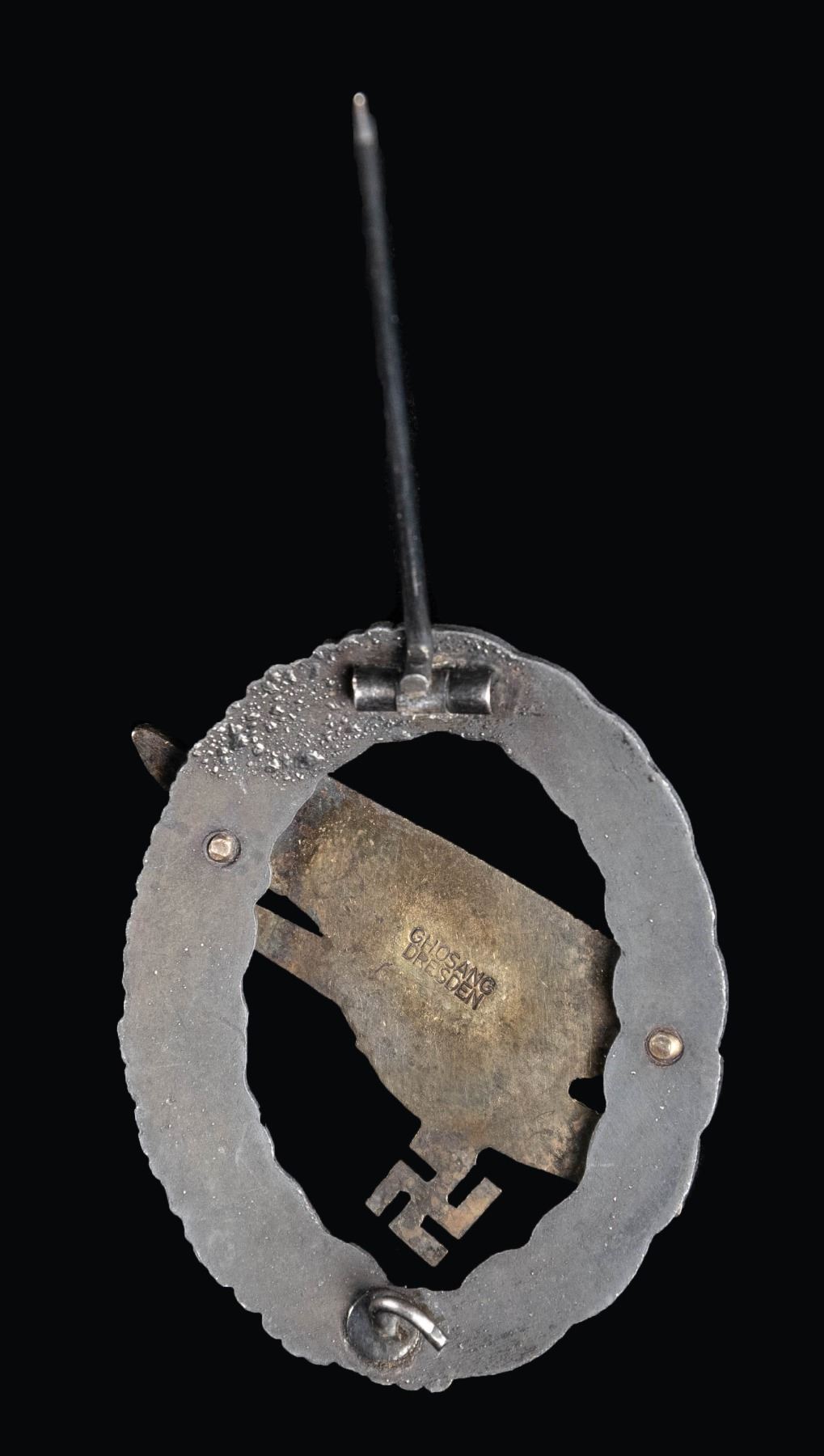 A quality reproduction of a WWII German Luftwaffe Paratrooper Badge marked on the reverse "G. H. OSANG DRESDEN". CONDITION: very light wear. PROVENANCE: Estate Collection of John "Jack" Dhooghe. (02-25572/BF). NON-GUN. $50-100.