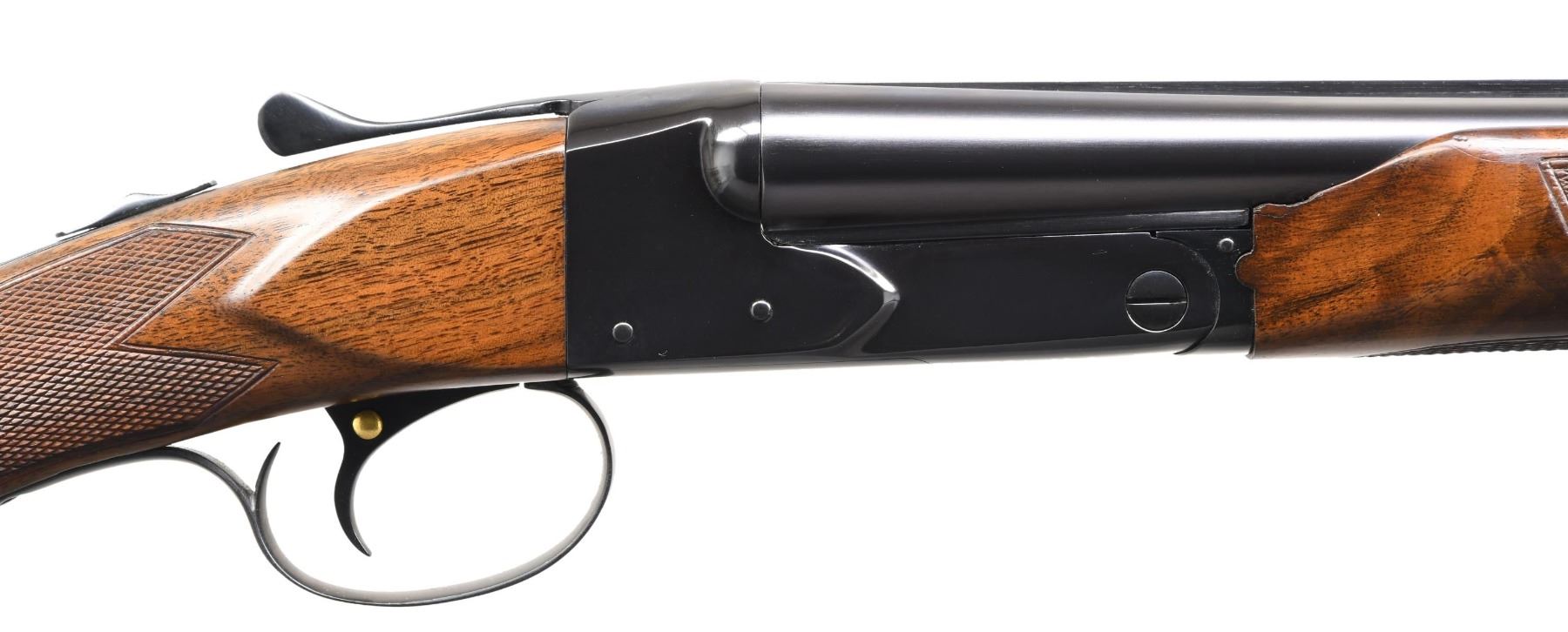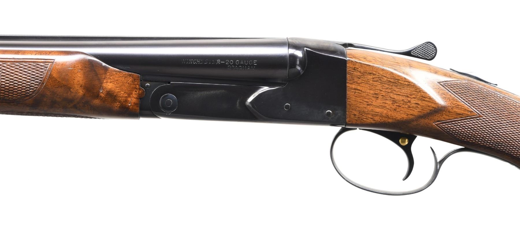 WITH EJECTORS, SINGLE TRIGGER AND BEAVERTAIL FOREND. Cal. 20 Ga. 2-3/4". S# 21996. The 26" barrels have slightly raised matted rib with Winchester markings on left side. All correct markings are on bottoms of barrels with choke markings for IC & Mod. Blued model 21 action with automatic safety and blued single selective trigger have Winchester info on watertable. Capped pistol grip buttstock of nicely fiddle figured American walnut measures 14-1/8" over checkered wood butt. Standard checkering is on grip. Matching braced beavertail ejector forend has usual "J" spring release and secondary knurled latch. MEASUREMENTS: BBLS: Bore Diameter: L .612. R .612. Restriction: L .006 flare (skeet) R .002 (skeet). Wall thickness: L .024. R .024. STOCK: DAH: 2-1/4". DAC: 1-7/16"+. CAST: neutral. LOP: 14-1/8". WEIGHT: 6 lb. 2 oz. CONDITION: fine as completely refinished. Metal parts retaining nearly all of a good quality re-blue. Sharp edges well preserved. Stocks retain nearly all of an oil refinish over some minor marks. Checkering re-cut. Bores are bright and shiny. Mechanically good. (24-3773/MGM). CURIO. $4,000-6,000.