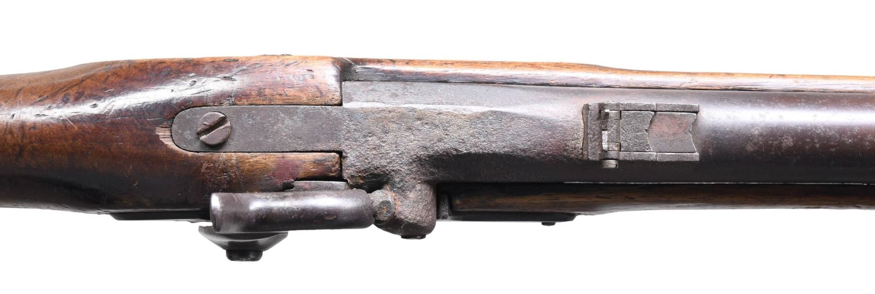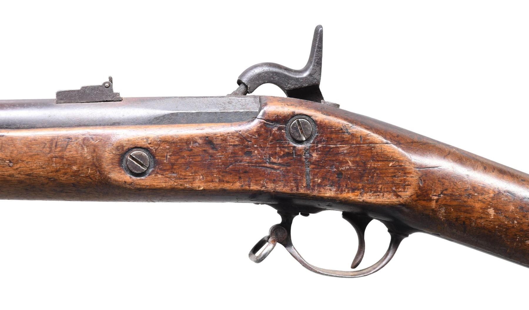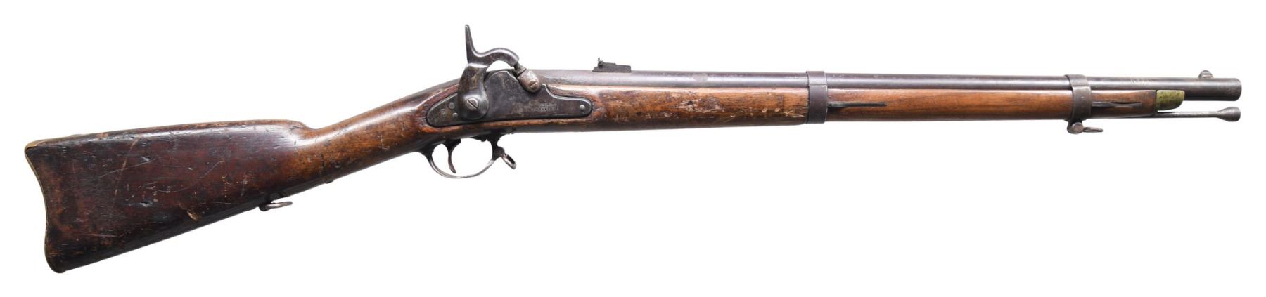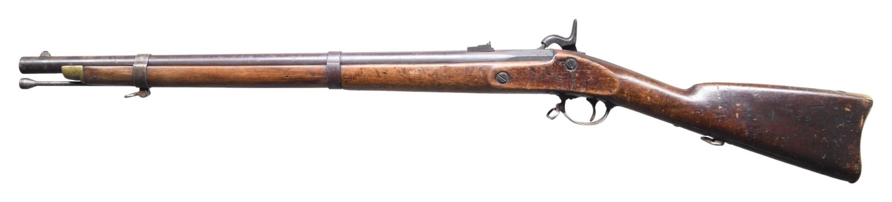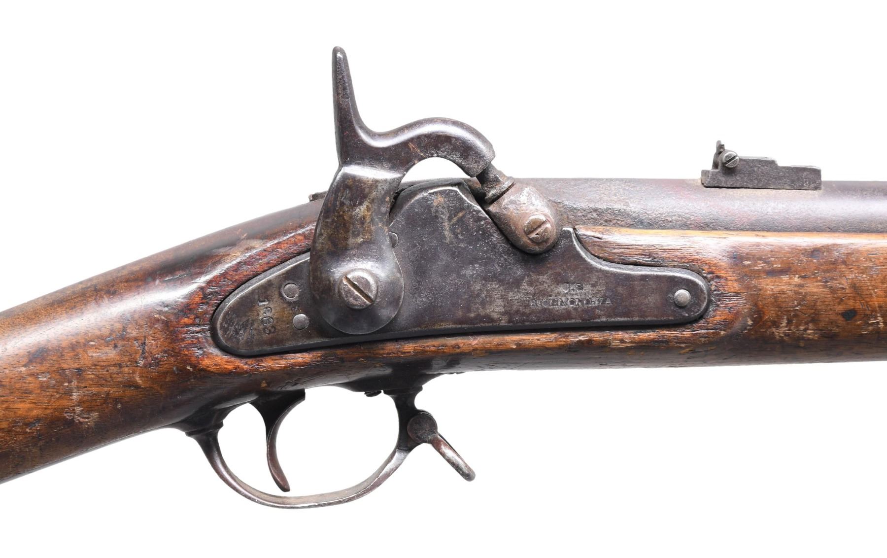 CARBINE DATED 1863. Cal. 58. NSN. Standard configuration with 3 sling swivels, 25" barrel, no visible proofs, correct 3 position-2 leaf rear sight, pinched front sight is restoration. Brass Richmond buttplate, 1863 dated Richmond lock, rear sling swivel is mounted on base instead of screwed in as Richmond Armory produced. CONDITION: good to very good as restored, stock is "stretched" from rear band forward. Front band and nose cap are part of restoration. Mechanics fine, good dark rifled bore. Restoration is very good and carbine looks original without close scrutiny. (01-27008/JS). ANTIQUE. $1,500-2,500.