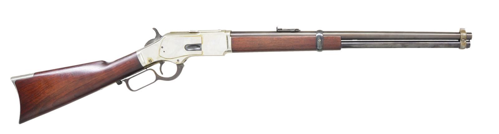 Cal. 44 WCF (44-40). S# 281242B. Bbl. 20" carbine style replacement w/o mfg. markings. Band mounted blade front sight w/ graduated leaf rear sight. Full length mag. Nickel finished action has saddle ring on left side. Band fastened walnut carbine forearm w/ straight grip rifle stock having a nickel finished trap door crescent steel buttplate. Mfg. 1888. CONDITION: restored rifle retaining 95% reblued finish on bbl. & mag. tube. Receiver & buttplate are renickled showing light marks. Refinished wood shows light scratches. Bright near excellent bore. (01-22993/DS). ANTIQUE. $1,000-1,500.