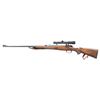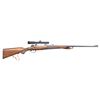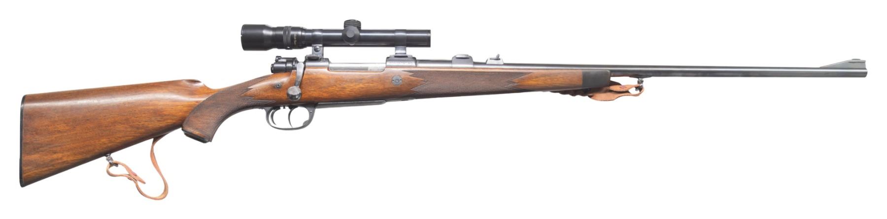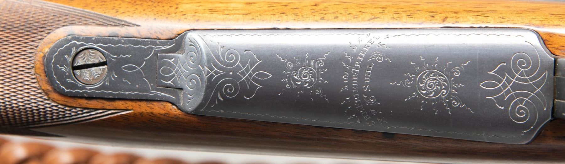 ACTION SPORTING RIFLE WITH ACCESSORIES. Cal. 6.5x68S. S# 8742. Bbl. 26". Mauser 98 pattern action bolt action sporting rifle mfg. by the firm Christoph Friedrich Triebel in 1941. The top of the rnd. tapered bbl. is engraved with the retailer marking "WILHELM EBLEN. STUTTGART.", followed by "PATRONE/ 6,5 x 68S", which is engraved horizontally towards the breech. Left side of the bbl. is engraved "ROCHLING SONDERSTAHL R7L", which is repeated below the wood line, followed by the S#, an Eagle/N commercial nitro proof (repeated on left side of chamber and on the top of the bolt root), "Suhl", an unidentified shielded logo, and the date code "141" (January, 1941). The receiver features light decorative border engraving (which extends to the breech end of the bbl.), with some small highlights of scrollwork. Trigger guard features wavy line engraving along the edges, which terminates in a geometric pattern at the rear, with a small scroll motif engraved at the center of the bow. Floorplate exhibits matching pattern engraving, with "CHR.FRIEDR.TRIEBEL" engraved towards the center between 2 scroll motifs. Stock crossbar is engraved with a foliate motif on either side. Metal components exhibit a professionally reapplied blue finish overall, save for on the bolt body and extractor which are polished in-the-white. Lightly sanded and refinished 1-piece horn tipped wood pistol grip stock features a wrap around checkered panel on the forearm, checkered panels on either side of the wrist, a Greener safety, oblong dark horn pistol grip cap, left handed cheekpiece, as well as a grooved dark horn buttplate. Toeline of stock features a sling swivel, with the bbl. featuring an integral swivel on the underside. 1-piece trigger guard with hinged floorplate, interior floorplate release lever, as well as adj. double set triggers. Bolt knob features a circular knurled panel on the top, with a flat grooved panel present on the underside. Blade front sight on a finely knurled ramp, with a finely knurled dovetailed fixed blade front sight on an integral island base. Bbl. features a single dual claw scope mount, with the receiver featuring 2 dual claw scope mounts that are currently fitted with K. Kahles Helia-Super 1.5-4.5 scope. All serialized parts are matching, with the receiver and bbl. (below wood line) matching via the full S#, and with the trigger guard and bolt matching via "42". UNATTACHED ACCESSORIES: generic soft case containing a K. Kahles Helia-Super+ 8S2 8x56 fixed power scope. Rifle is also accompanied by 4 loose rds. of RWS 6.5x68mm ammunition. CONDITION: fine, with metal components retaining virtually all of their professionally reapplied blue finish, exhibiting some light superficial handling marks and some small spots of light surface oxidation overall. Sides of bbl. exhibit spots / streaks of light to mild surface oxidation and pitting along the edges of the wood line. Bore is bright, exhibiting scattered spots and patches of mild to moderate pitting, while retaining strong rifling throughout. Rifle is currently unsafe to fire due to slippage of either the cocking piece or sear, resulting in the firing pin being struck upon closing of the bolt or (if not tripped on closing of bolt) firing pin is struck when downward pressure is applied to the bolt. Otherwise, double set triggers function appropriately. Stock is excellent, as lightly sanded and refinished, exhibiting a 3/8" crack on the top of the wrist stemming from the receiver tang, with a small crack on the right side stemming from the rear trigger guard tang. Scopes both retain clear and sharp optics. PROVENANCE: From the Buckstix Collection. (25-6370/MLW). CURIO. $3,000-5,000.