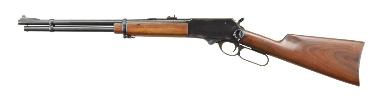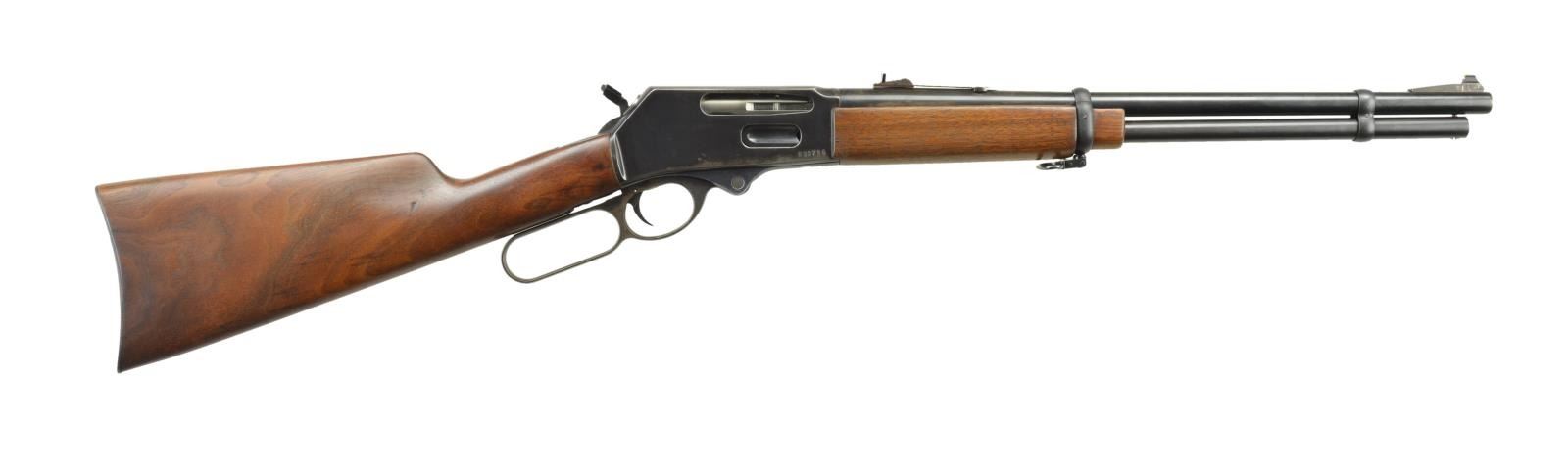 Cal. 30-30. S# 830786. Bbl. 18" w/ ramp mounted bead front & elevator rear sights. Tubular mag. Williams hammer extension. Receiver has saddle ring on left side, drilled & tapped top. Walnut stock set w/ metal buttplate & QD swivel. CONDITION: good blue w/ wear, marks & fading finish. Very good wood w/ a few deep impressions. Very good bore. (22-2379/MD). MODERN. $250-400.