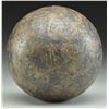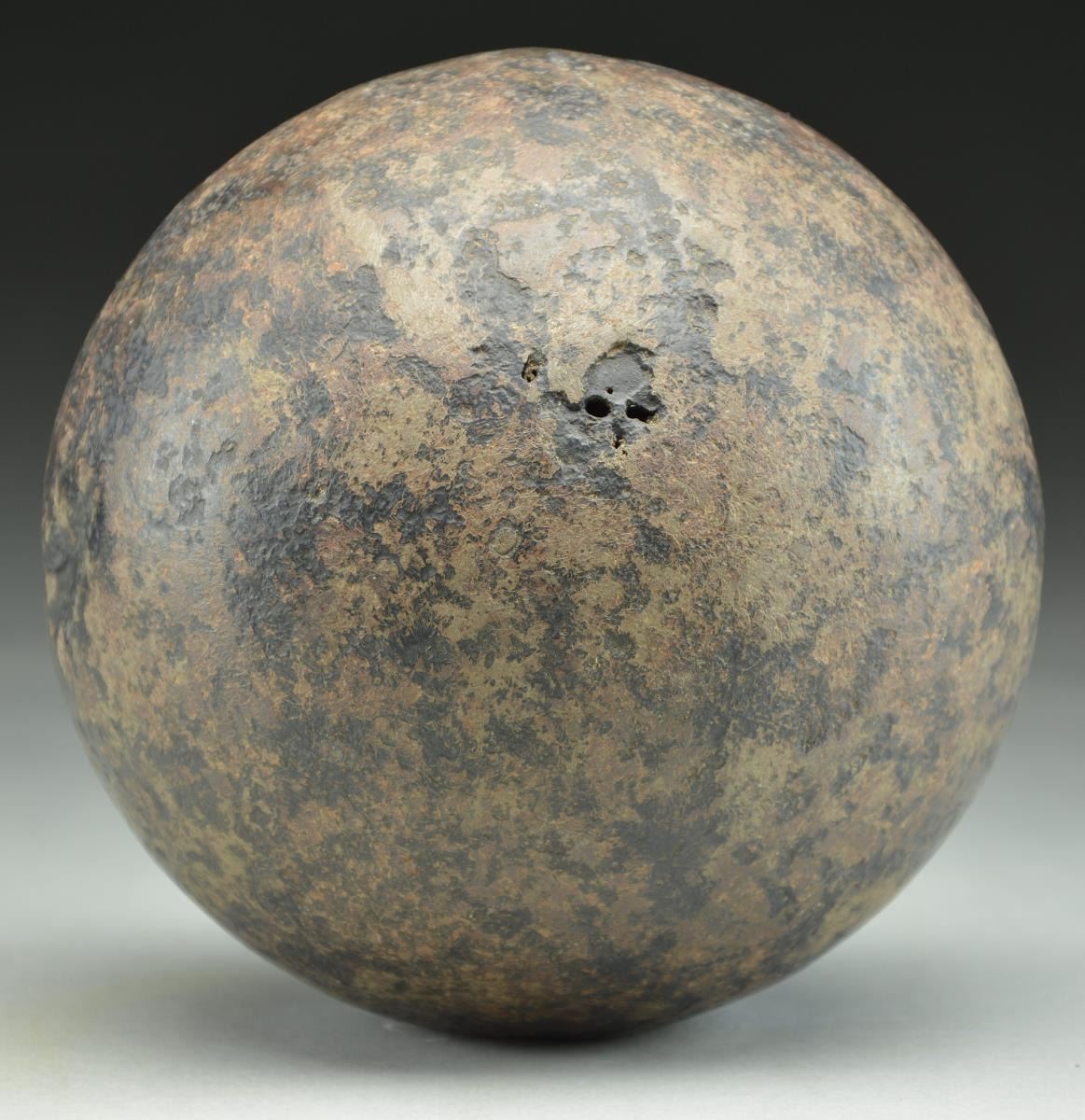 SHOT CANNONBALL. This early Revolutionary War era 24lb. cannonball has a bold broad arrow mark. The solid shot ball is approx. 5.82” in diameter. CONDITION: ball has been kindly cleaned and has a dark brown-black patina. Broad arrow is quite evident. (02-19569/BF). $600-900.