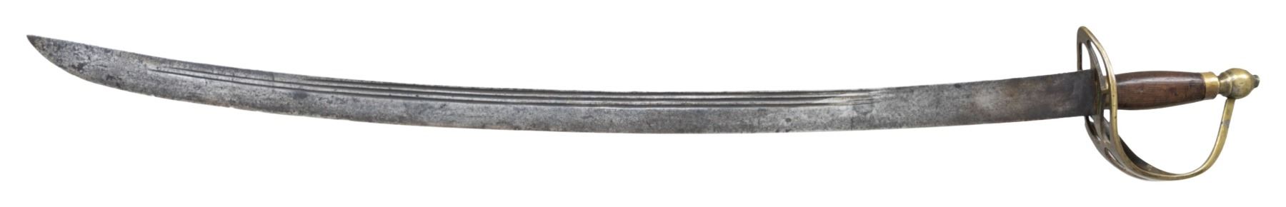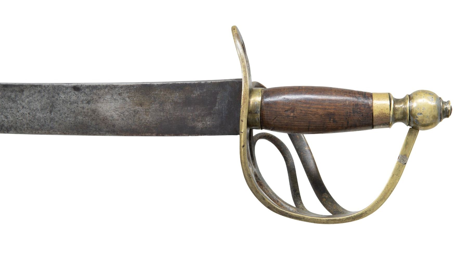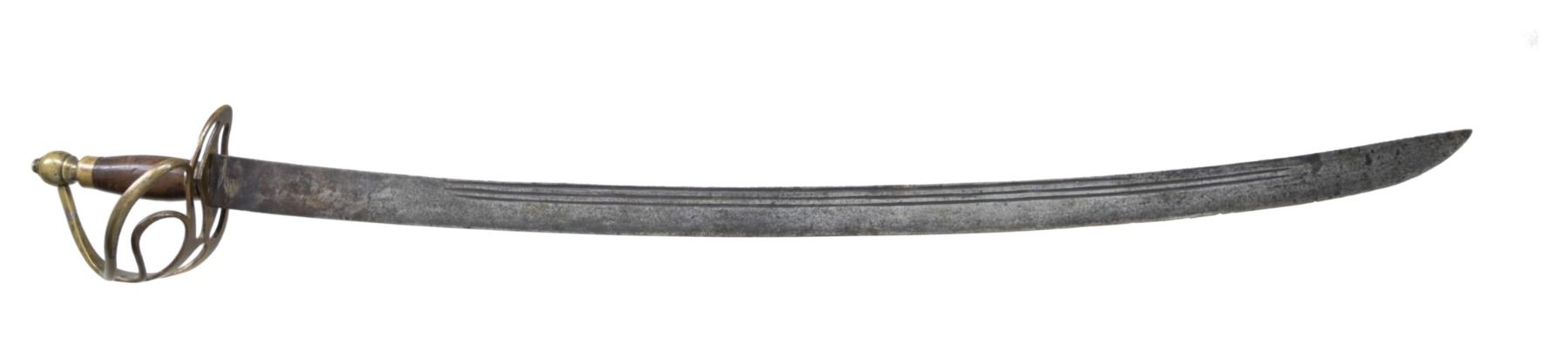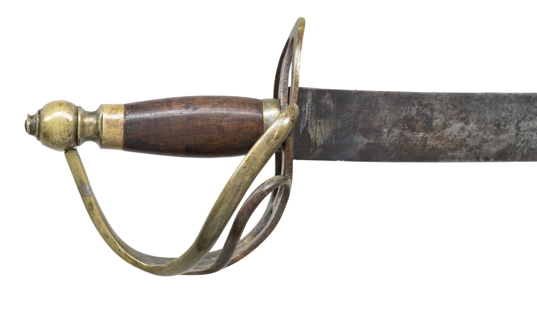 A good American Revolutionary War horseman's saber measuring 39 3/4" overall with a 34 1/2" plain 3 fullered blade likely of German manufacture. These 3 fullered blades were thought to be Spanish made for years, however recent scholarship has shown them to be of German origin. Plain brass semi-basket hilt with a 5 slotted lower guard combined with two branches that join the knuckle bow at different locations. Spherical pommel tops a plain ovate chestnut grip. No scabbard. CONDITION: blade is quite sturdy and has a deep gray patina. The guard has a great mellow mustard patina. Grip shows expected wear. (02-25198/BF). $3000-4000.