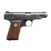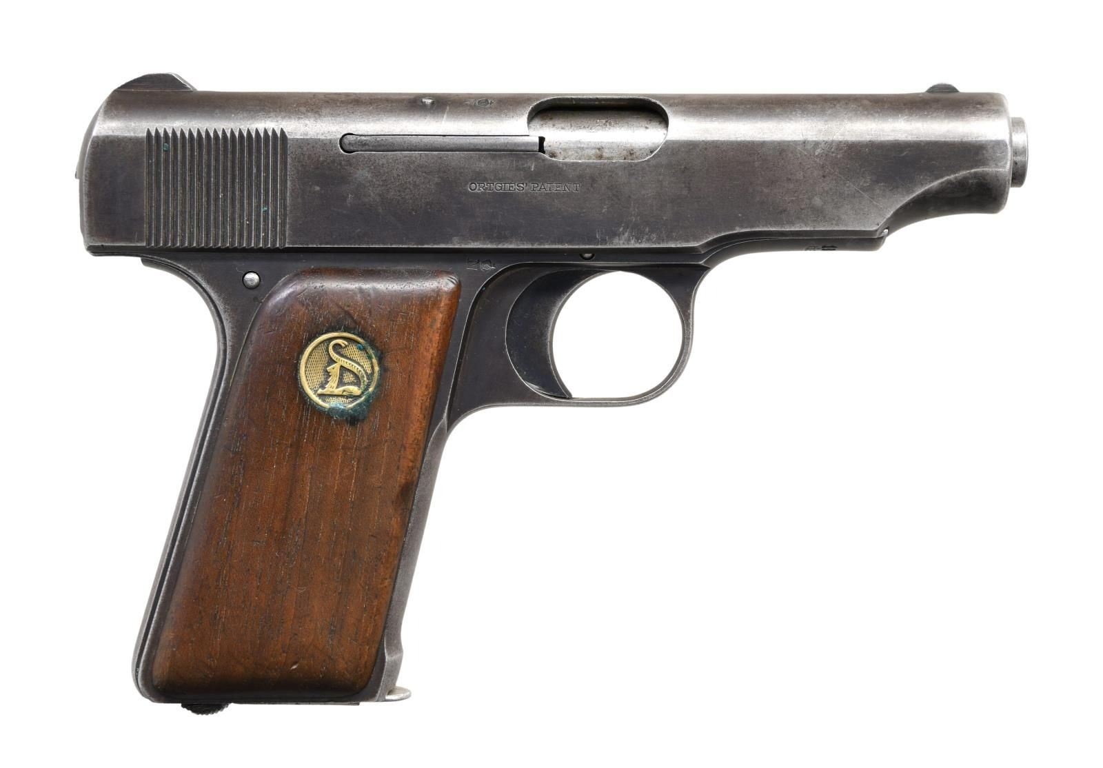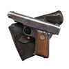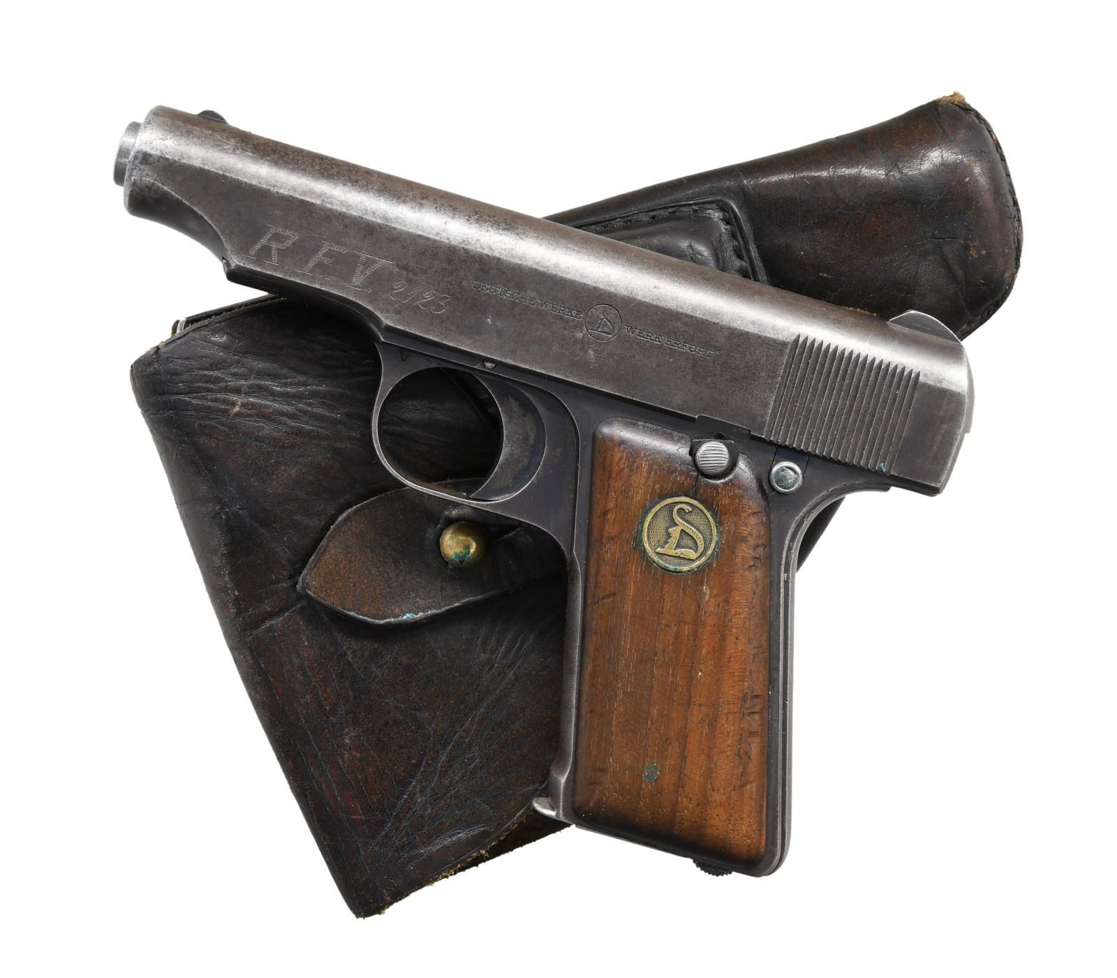 Cal. 7.65mm (32 ACP). S# 180964. Bbl. 3 1/4". Round blade front sight and U-notch rear sight. Right side of the slide has the "RFV 2123" marking, denoting an issue by the German Reich Finance Administration. Blued finish. Left side of the frame has a safety feature that does not appear to be functioning correctly. Smooth walnut grips with the Ortgies logo. MAGS: 2-7 rd. One mag is matching-numbered to the slide RFV rack number, and the other is unnumbered. UNATTACHED ACCESSORIES: leather holster in fair condition. CONDITION: left grip panel shows a small crack above the medallion; the grips otherwise show some black staining, dings, & handling marks. Metal retains 30% of its original blue with overall fading to gray, edge wear, and some scattered light oxidation. Good bore with some light oxidation. PROVENANCE: from the lifelong collection of Robert "Mike" Bricker. (24-1081/MJC). CURIO. $200-300.