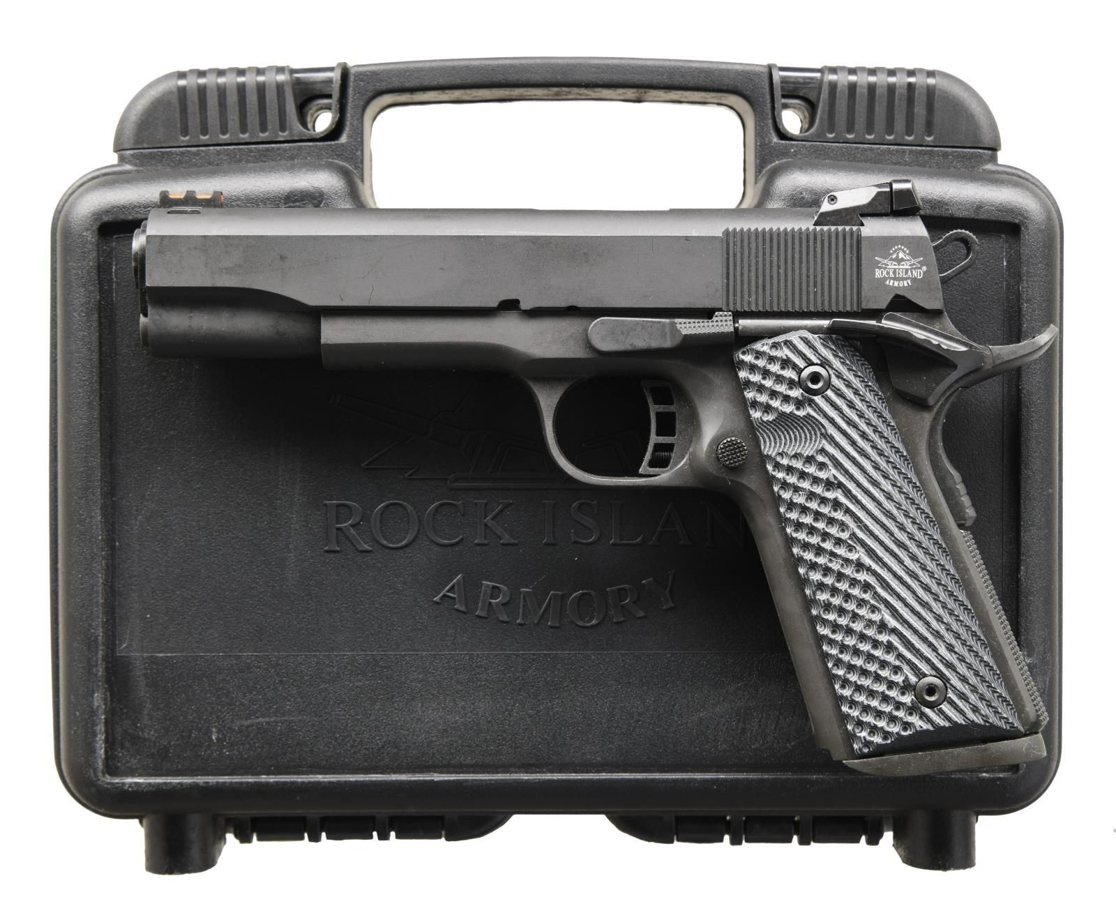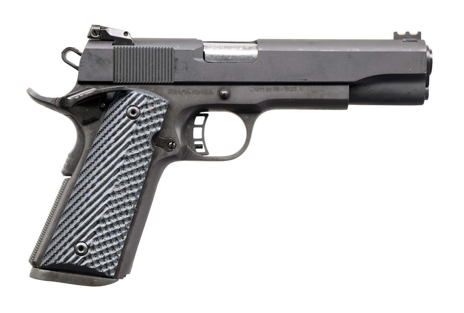 Cal. 9mm Luger. S# RIA2510196. Bbl. 5". Fiber optic front sight. Adjustable white dot rear sight. Extended ambi safety. Extended ambi beavertail grip safety. Matte parkerized finish. G10 grips. MAGS: 1-10 rd. UNATTACHED ACCESSORIES: factory hardcase w/ manual & cable lock. CONDITION: all aspects near new, in the box w/ traces of factory grease present. PROVENANCE: the Collection of Gun Sport Ltd owned by Jon R. Thomas. (23-2858/MJC). MODERN. $350-550.