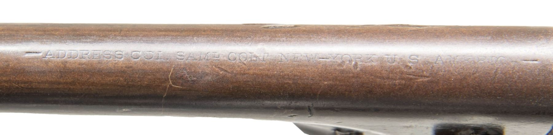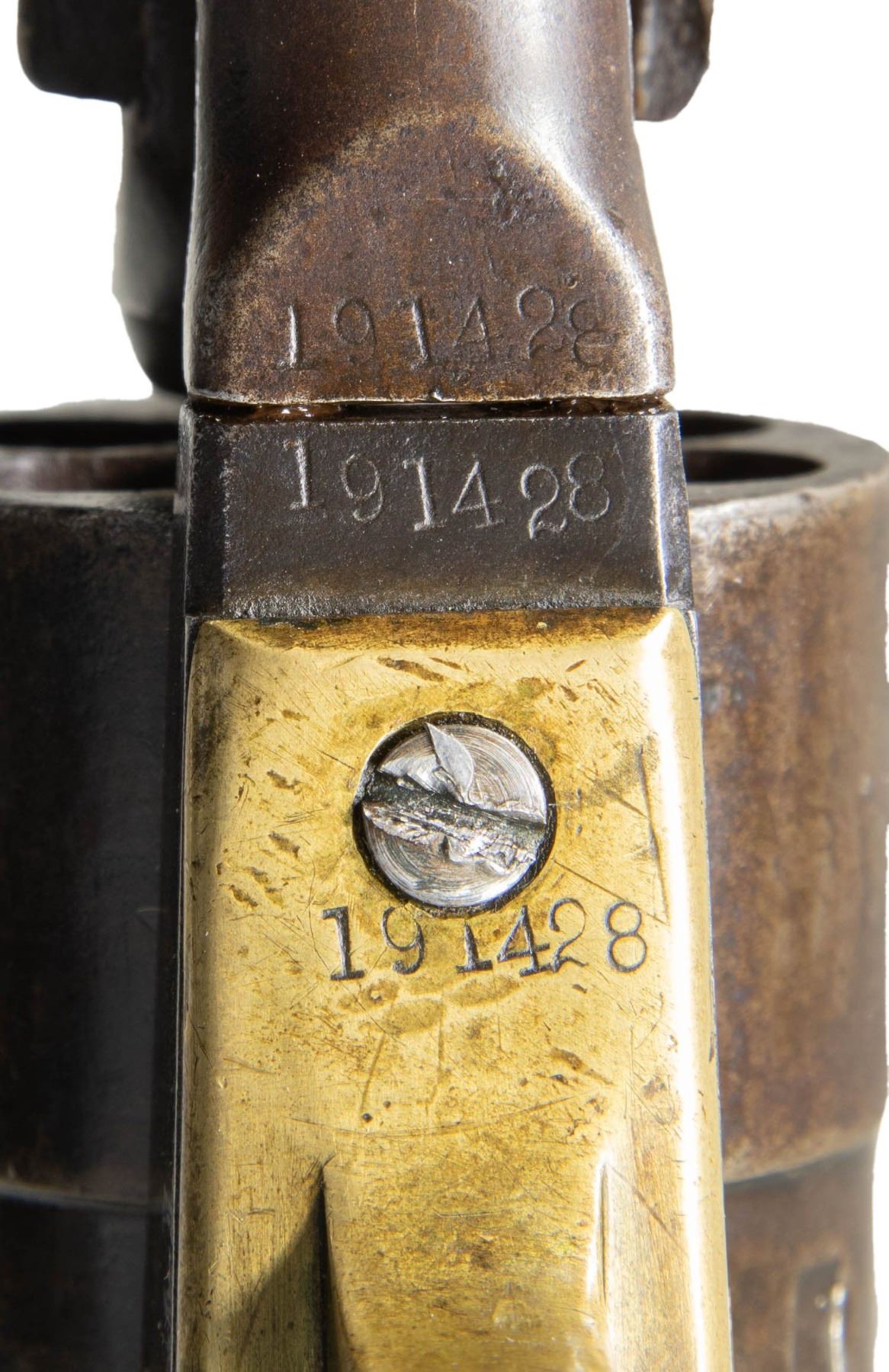 Cal. 44CF. S# 191428. Standard configuration, 8" barrel, 1-line New York address, ejector has been purposely removed, 6-shot rebated cylinder with naval battel scene, conversion ring with integral rear sight, loading gate with external spring, 2-line patent on frame, 1-piece walnut grips. Manufactured mid 1870s simultaneous with first single actions. CONDITION: good overall, well worn, muzzle wear, traces of cylinder scene and partial S#, re-varnished grips with "399" stamped, unserialized spring wedge. Mechanics are sloppy, good rifled bore with pitting. (01-28189/JS). ANTIQUE. $800-1,200.