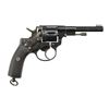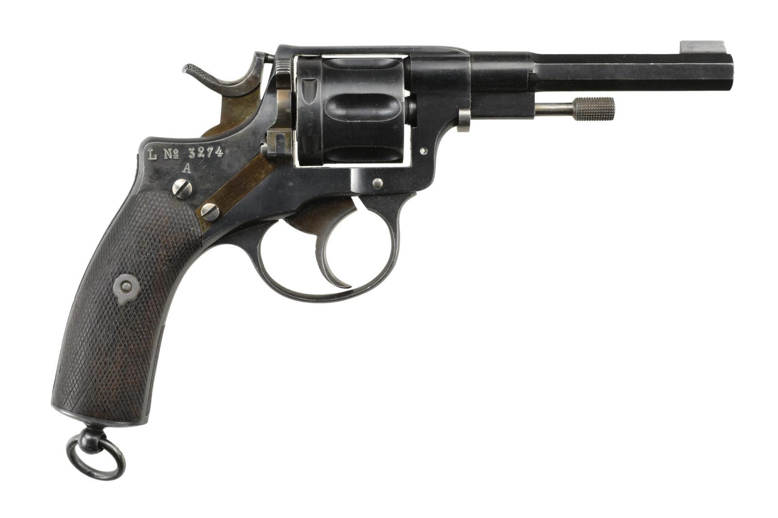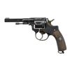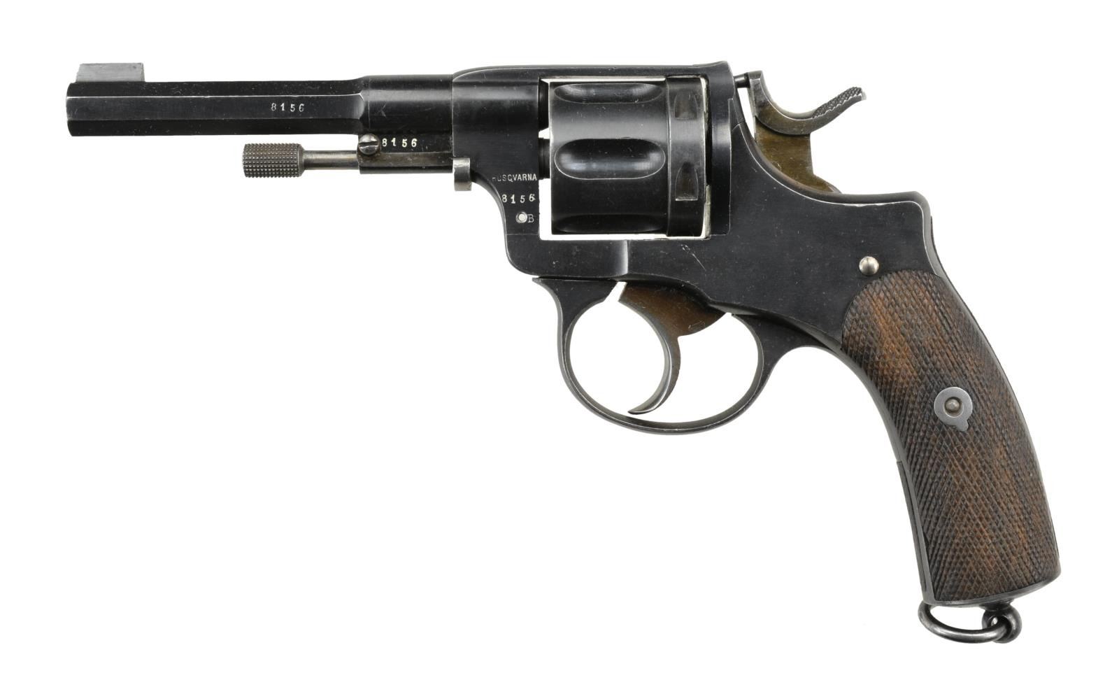 Cal. 22 LR. S #8156B. Bbl. 4 1/2". All visible matching numbers. Left side of frame marked marked "HUSQVARNA" w/ S #. Right rear of frame marked "L No 3274/A". Revolver has 22 LR inserts in cyl. & bbl. It is believed this conversion was done by American importers. Small hole present on front of frame. Checkered wooden grips. CONDITION: grips show a couple light chips w/ scattered handling wear. Hammer, cylinder release & trigger retain strong amounts of straw w/ fading & some oxidation staining. Balance of metal retains 80% arsenal rework blue w/ scattered fading, some high edge wear and a few spots of light oxidation. Very good bore. (22-2426/MJC). MODERN. $200-400.