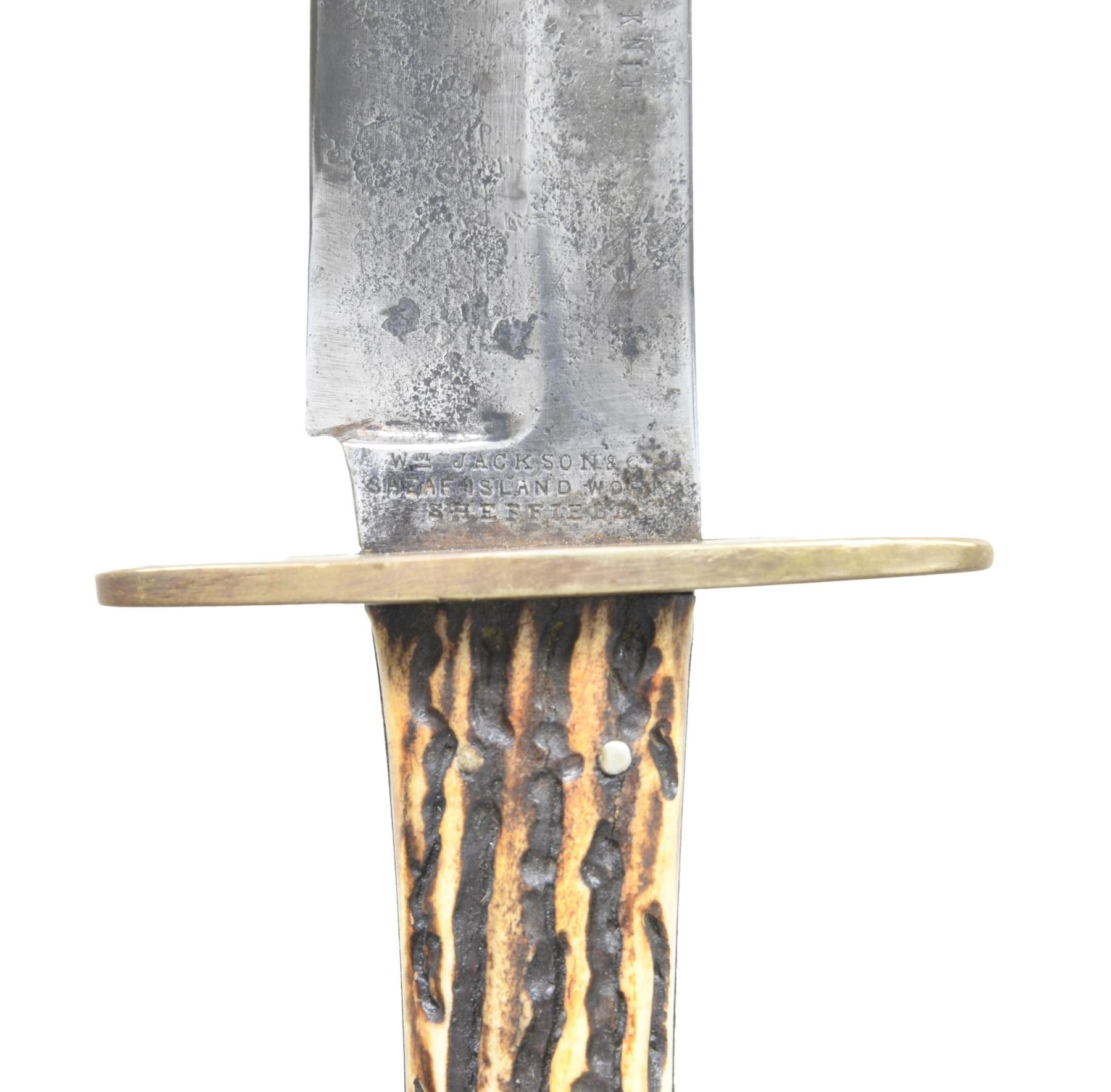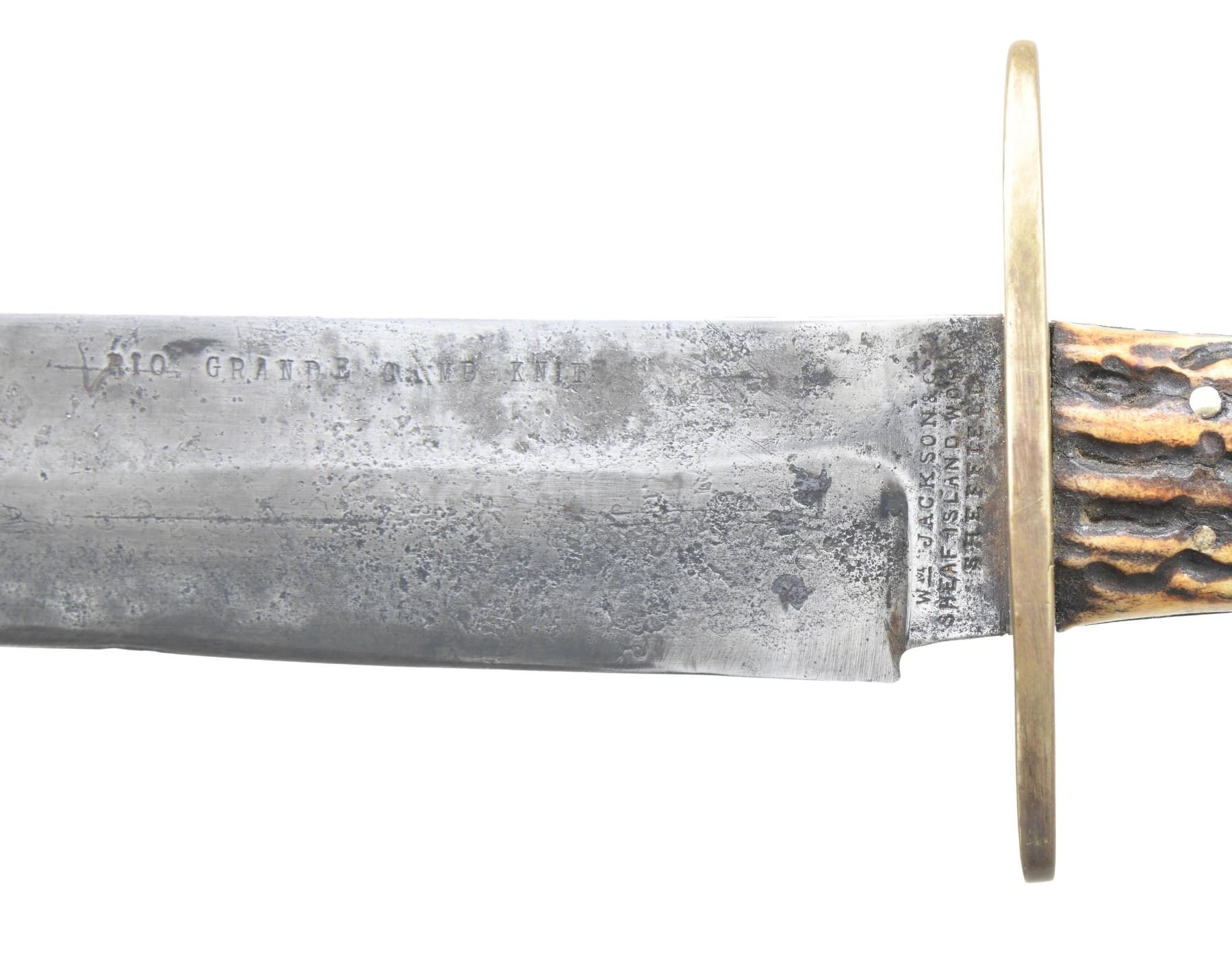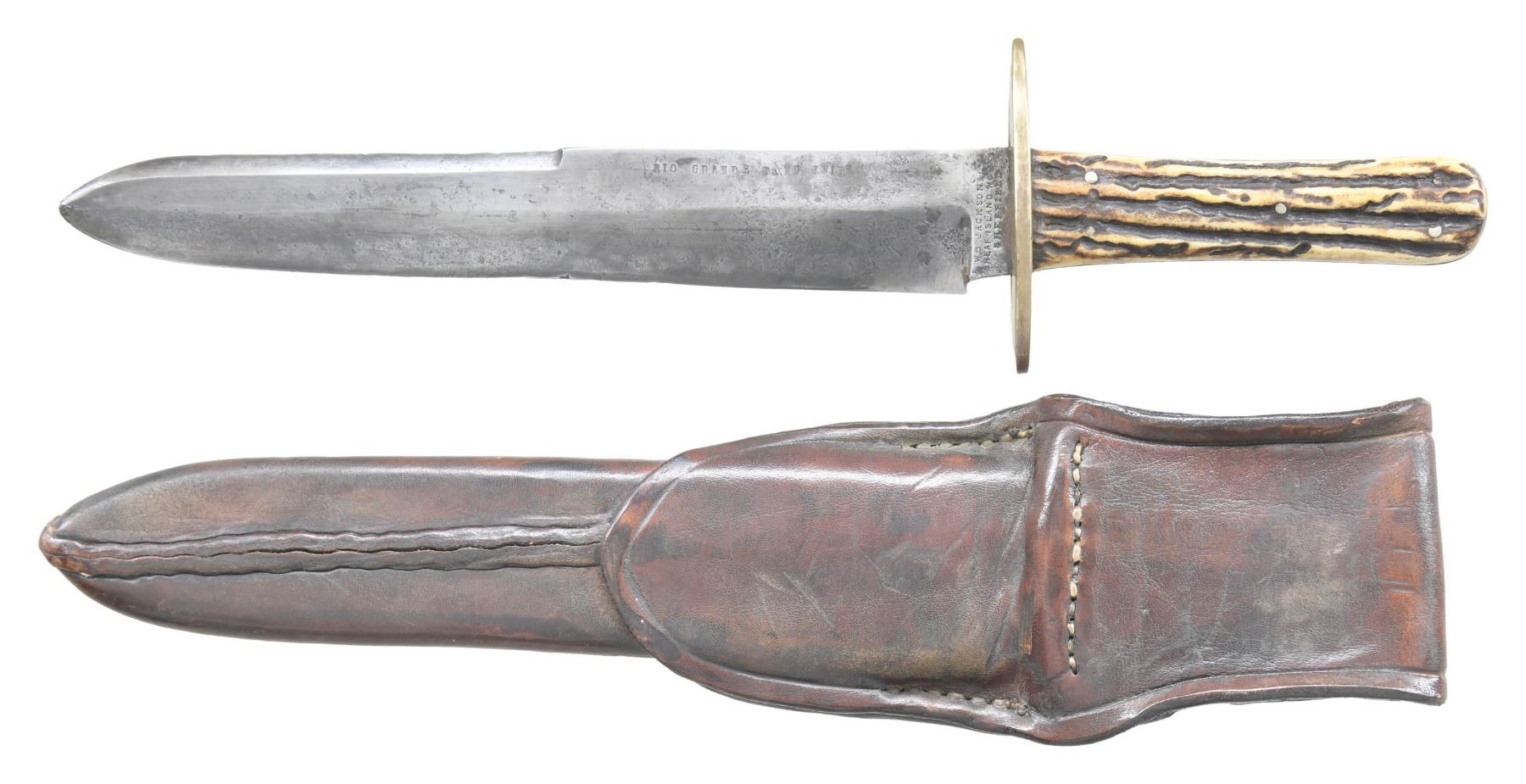 Well worn example of classic "William Jackson / Sheath Island Works / Sheffield" bowie with 8.5" stamped "Rio Grande Camp Knife". John Wilkes Booth famously carried similar knife when he assassinated Lincoln at Ford's theater. Most survivors of this popular import saw hard use losing blade form from repeated sharpening, like this survivor. CONDITION: good overall, blade heavily buffed, sharpened with staining and pitting but Mark's still good and discernible, blade was originally about 10" long. Well made leather sheath fits knife well. (02-24556/JS). NON-GUN. $1,000-2,000.