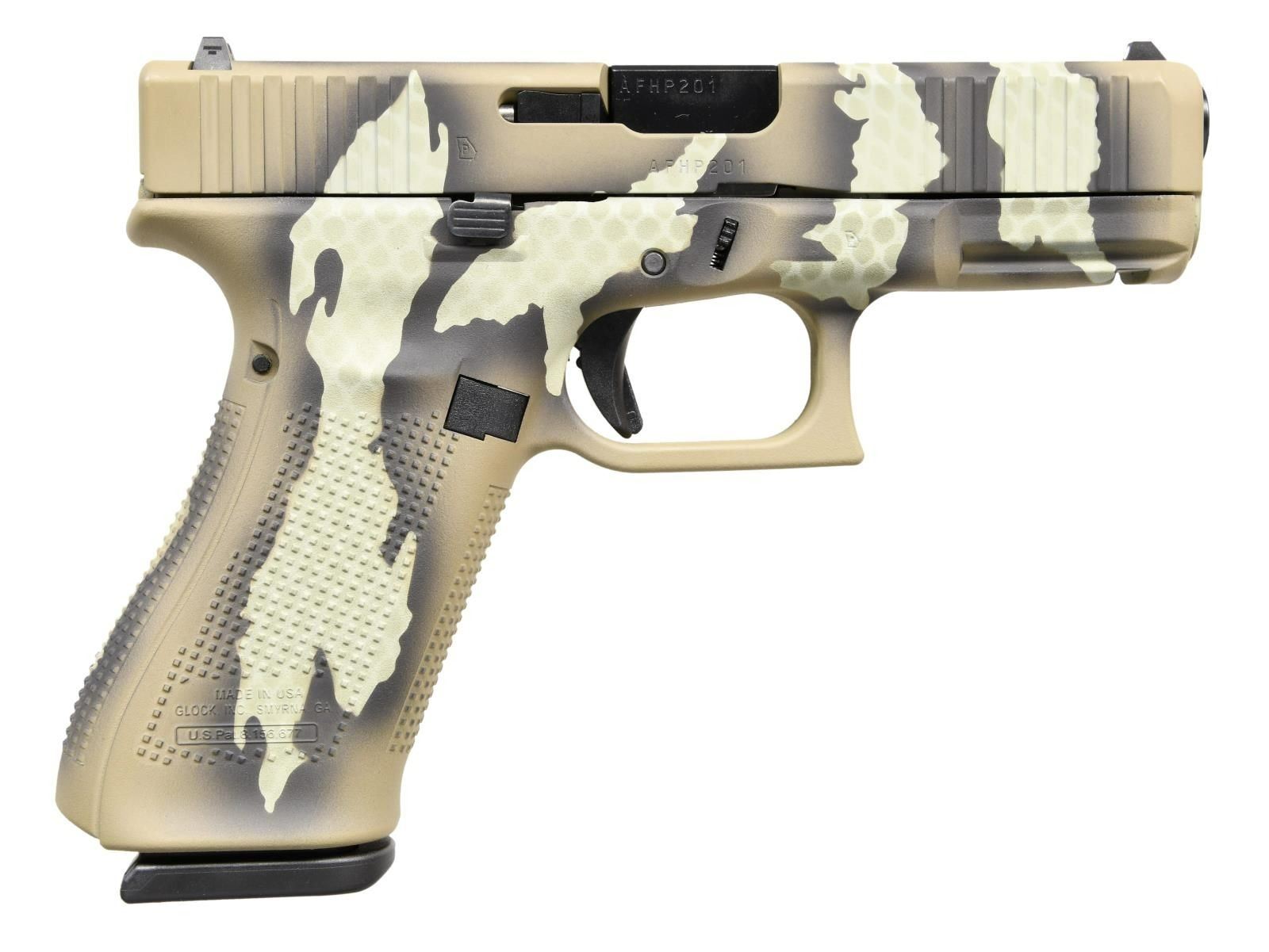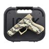 Cal. 9x19. S# AFHP201. Bbl. 4". Standard white outline Glock sights. Riptile camo finish. Ambi slide release. Enlarged mag release. Slide has front & rear serrations. Polymer frame w/ accessory rail. MAGS: 3-17 rd. factory. UNATTACHED ACCESSORIES: factory hardcase matching numbered to gun w/ foam inserts, cleaning rod, bore brush, paperwork, cable lock & four interchangeable backstraps. CONDITION: all aspects near excellent. PROVENANCE: The Collection of Gun Sport Ltd owned by Jon R. Thomas. (23-3137/MJC). MODERN. $300-500.