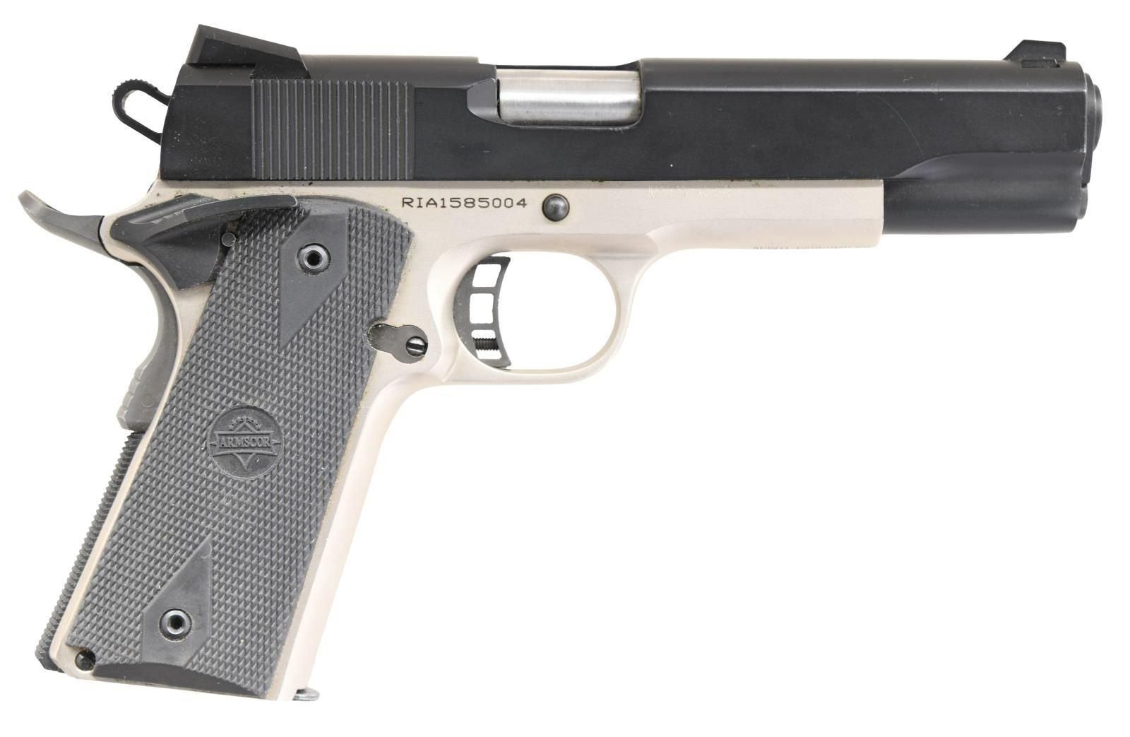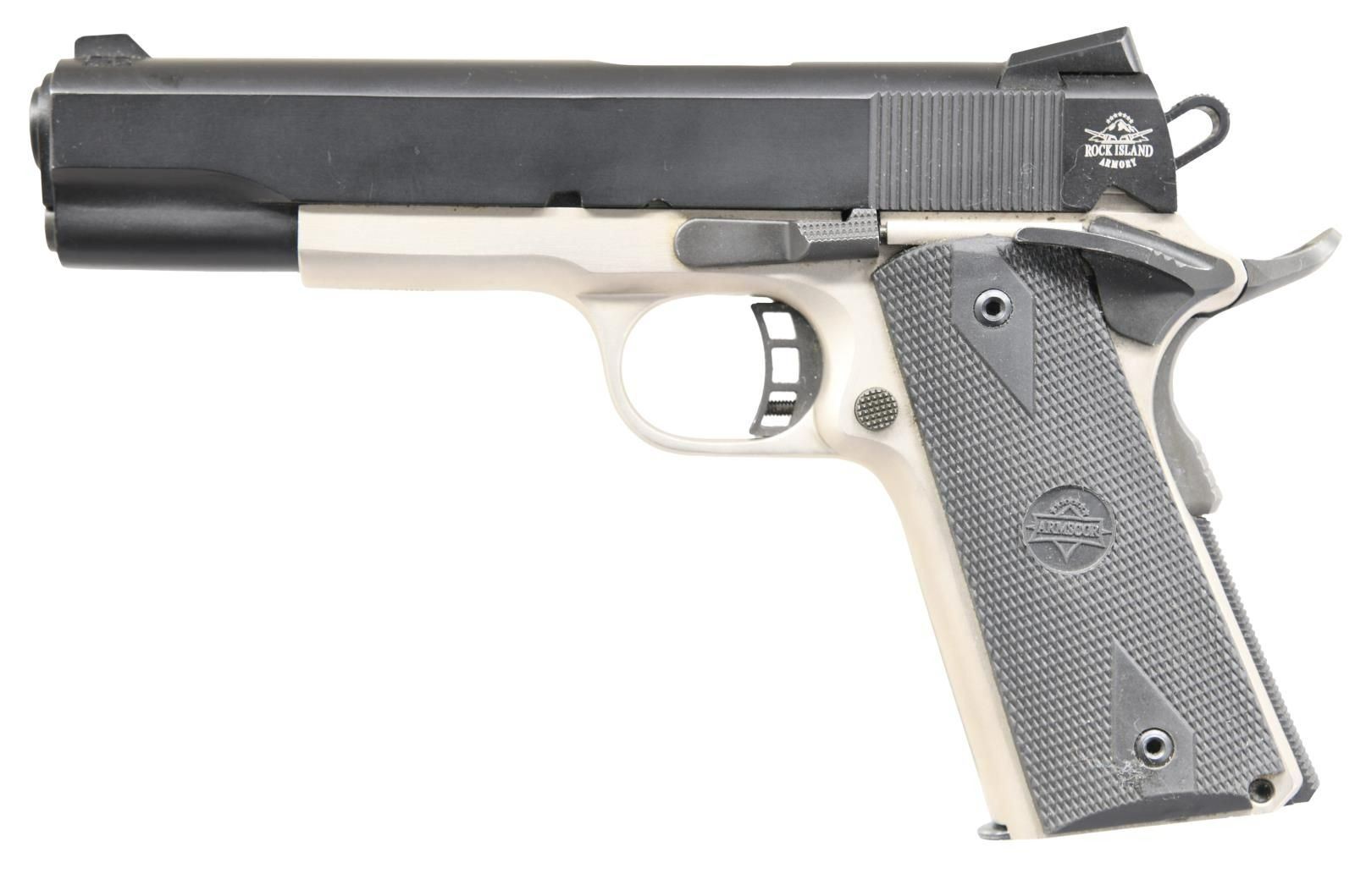 PISTOL. Cal. 45 ACP. S# RIA1585004. Bbl. 4 7/8". Model 1911-A1 FS semi-automatic pistol mfg. by Rock Island Armory. Left side of slide is marked with Rock Island Armory's logo. Right side of frame exhibits the S# and model designation, with "APINTL-PAHRUMP NV. PHILLIPINES" importer mark on the underside of the frame. Matte stainless steel frame, with matte black finished slide and small components. Frame is mounted with 2-piece checkered black rubber "ARMSCOR" grips. MAGS: 1 8-rd. CONDITION: metal components retain the vast majority of their original factory finishes, exhibiting scattered handling marks overall. Mirror bore, exhibiting a layer of grease and retaining well defined rifling throughout. Grips show a few marks from handling and storage, but otherwise remain sturdy and serviceable. (23-6880/MLW). MODERN. $550-750.