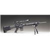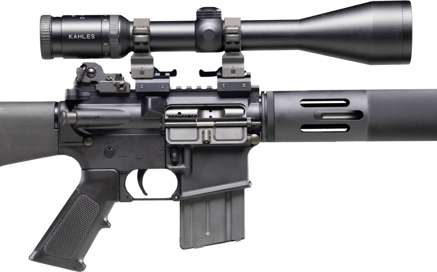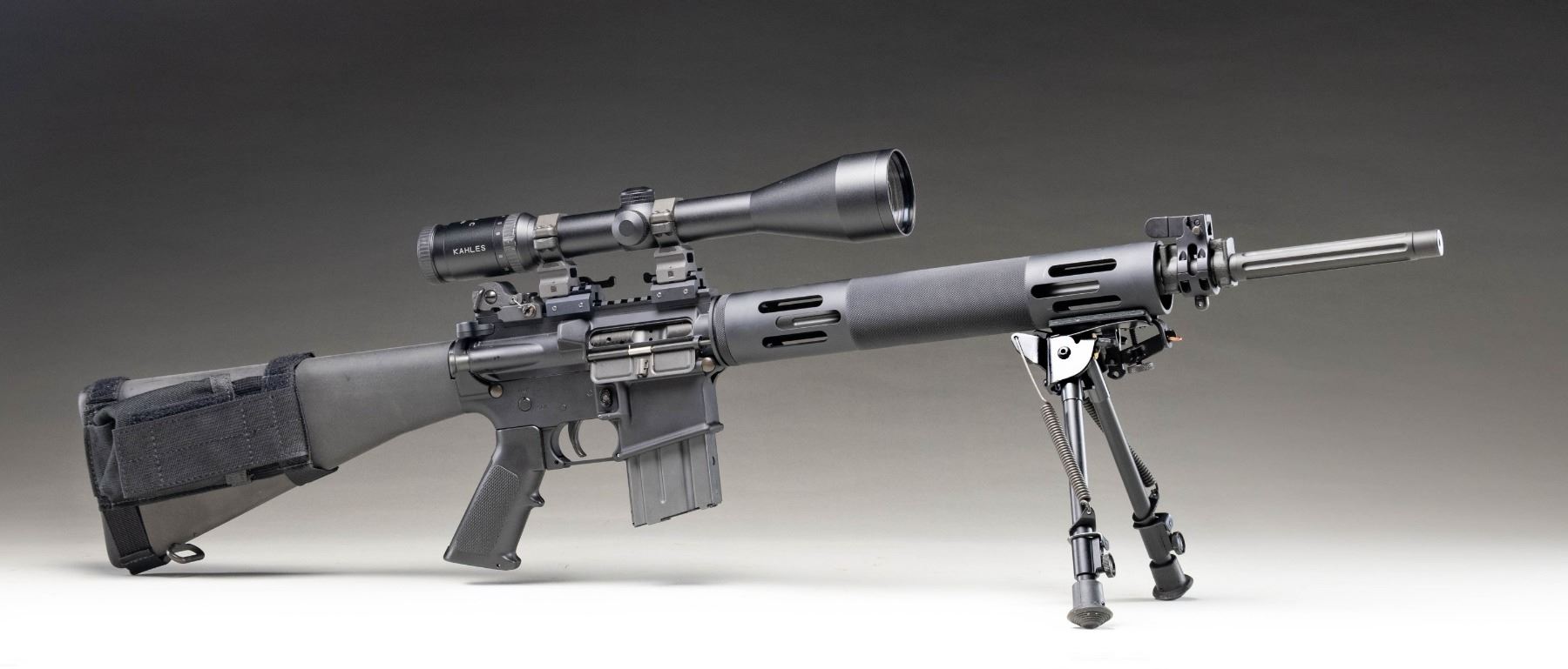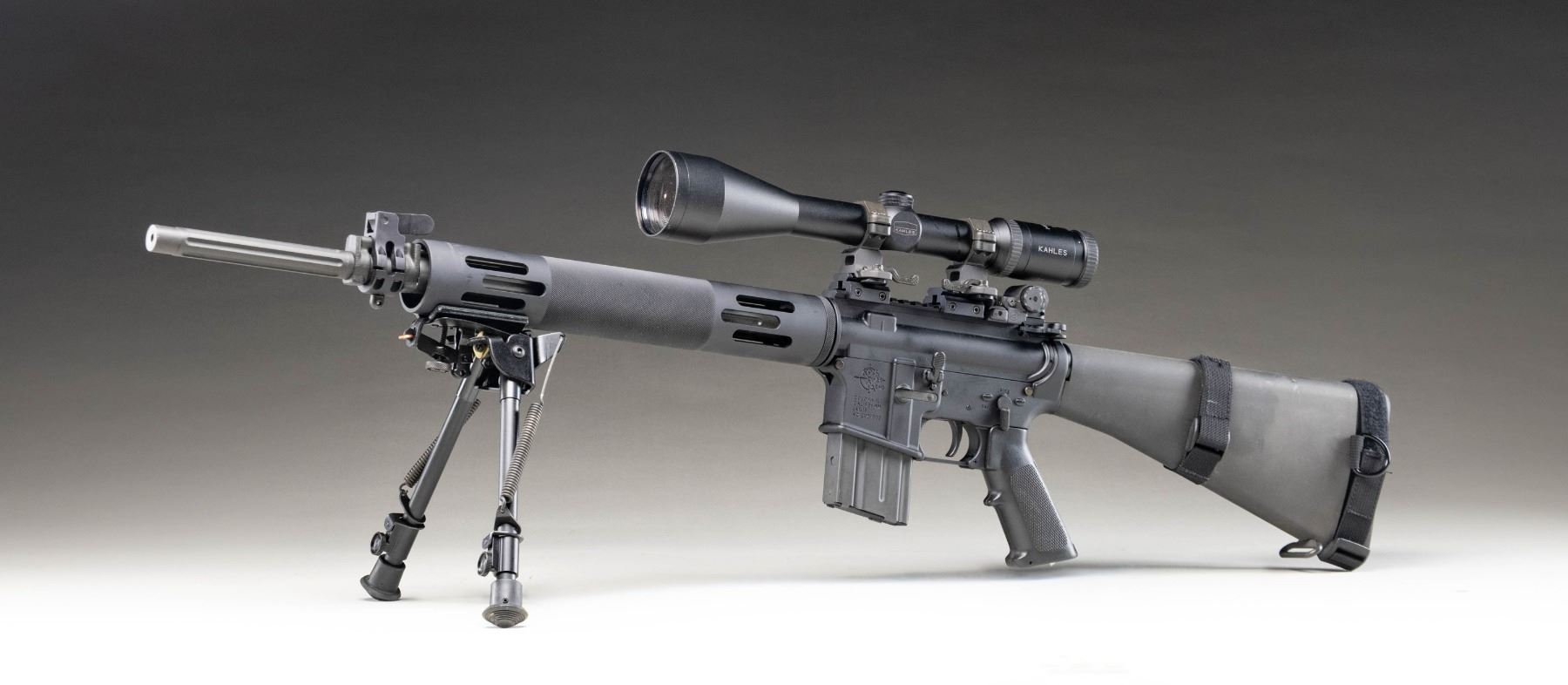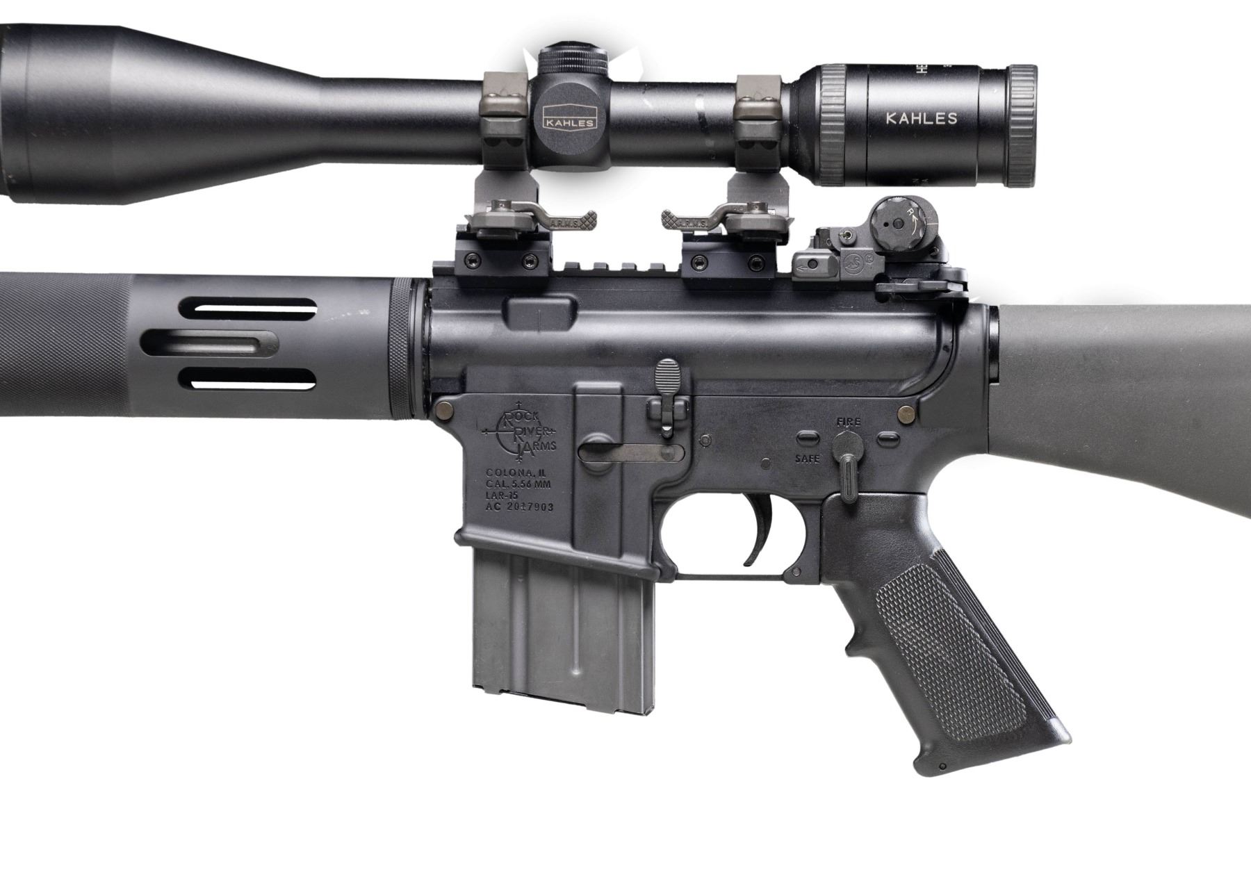 DESIRABLE KAHLES HELIA C SCOPE. Cal. 5.56mm. S# AC2017903. Bbl. 20". LAR-15 semi-automatic rifle mfg. by Rock River Arms. Left side of the receiver is marked with Rock River Arms' logo and mfg. information above the model and cal. designations, as well as the S#. Aluminum receiver, flat top upper, and handguard exhibit a matte black finish, with the fluted bbl. and some small parts exhibiting a phosphate finish. Rnd. ventilated and checkered aluminum handguard, with checkered black synthetic A2 pattern pistol grip, and fixed A2 pattern buttstock with plain synthetic buttplate. Underside of handguard is fitted with a Harris SL bipod. Right side of the buttstock is fitted with a black nylon Tactical Tailor single cell mag. pouch. Yankee Hill Machine folding post front sight with A.R.M.S. flip-up dual aperture rear sight. Upper assembly rail is fitted with 2 picattiny raisers with A.R.M.S. #22H throw lever scope rings, featuring a Kahles Helia C 3-12x56mm scope. MAGS: 1 aluminum Colt 20-rd. CONDITION: metal components retain the vast majority of their original factory finishes, exhibiting some light superficial handling marks overall. Bbl. exhibits scattered spots of light to mild surface oxidation at and around the muzzle area. Mirror bore, retaining well defined rifling throughout. Black synthetic furniture shows some superficial marks from handling and storage, but otherwise remains very good overall. Scope retains a clear and sharp optic. (25-4623/MLW). MODERN. $1,000-1,500.