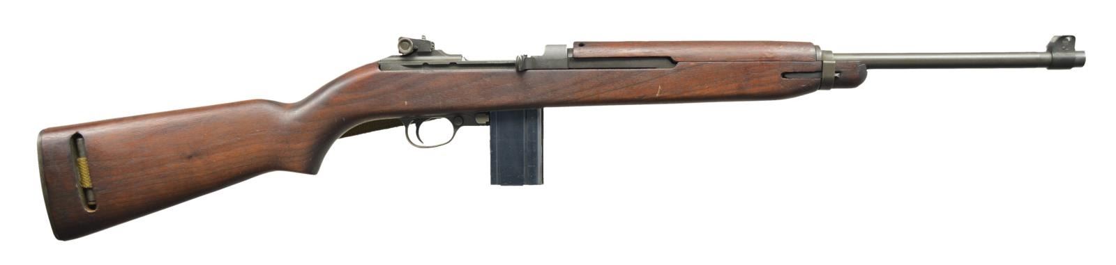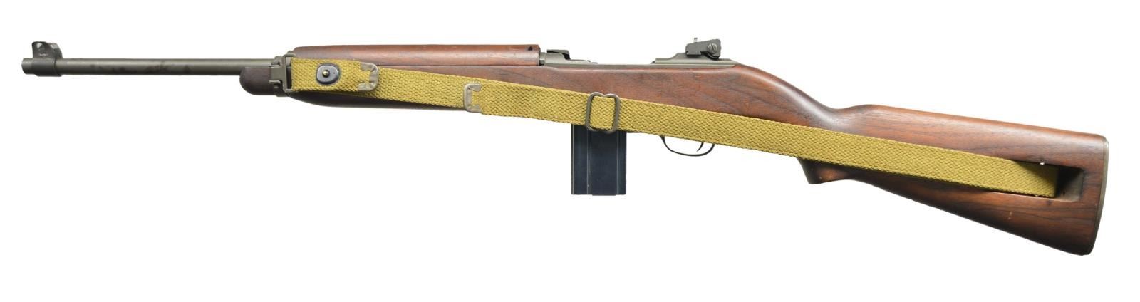Cal. 30 Carbine. S# 4619296. Bbl. 18". Mfg. March 1944, carbine has a mix of early & late features; bbl. & recoil plate are “ROCK OLA”, stamped front sight “RP”, milled adjustable rear sight “PI”, early 2 rivet handguard “RSG”, low wood stock “RSG”, Type I barrel band “M-R”, “ROCK OLA” trigger group & “KR2” hammer, blued flat bolt & operating rod both “ROCK OLA”. Original WWII era C tab web sling & oiler. MAGS: 1-15 rd. “KI”. CONDITION: metal retains strong parkerized finish w/ no visible import mark, but some rust spots & staining between front sight & stock tip. Bolt is blued. Stock set has a few scattered dings & scratches but retains strong finish. Bore is near excellent, bright & strong. (22-3472/CW). CURIO. $700-1,000.