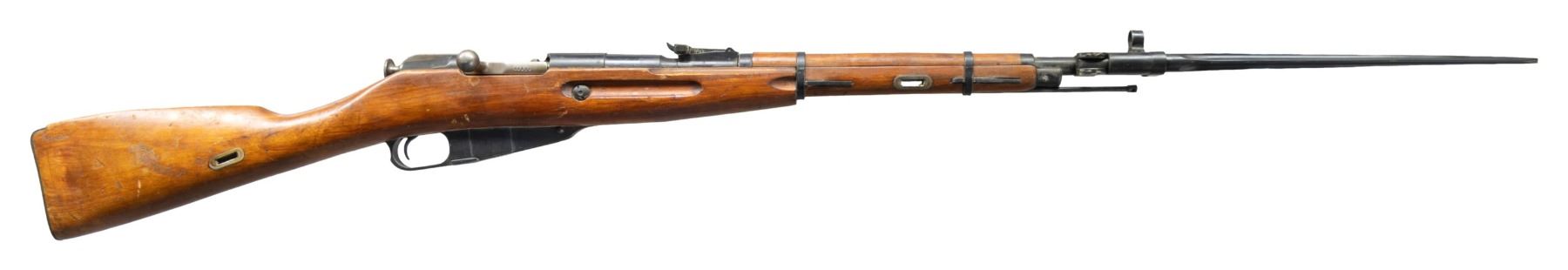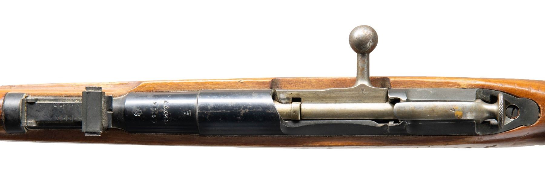 Cal. 7.62x54R. S#KM777. Bbl. 20 1/2" with Century import marking. Standard M44 Mosin sights. Bolt is mismatched but other parts are matching to bbl. shank. Bbl. shank has standard Romanian markings with serial & 1954 date. Left side of receiver has importer added serial number. Hardwood stock set with pressed in sling slots. Folding spike bayonet present. Hungarian made cleaning rod present. CONDITION: stock set shows scattered dings, handling wear, worn finish, staining & handling marks. Metal retains 85% arsenal bleu with scattered edge wear, light oxidation, dried grease & some oxidation. Action functions properly when hand cycled. Very good bright bore. (25-3790/MJC). CURIO. $200-300.