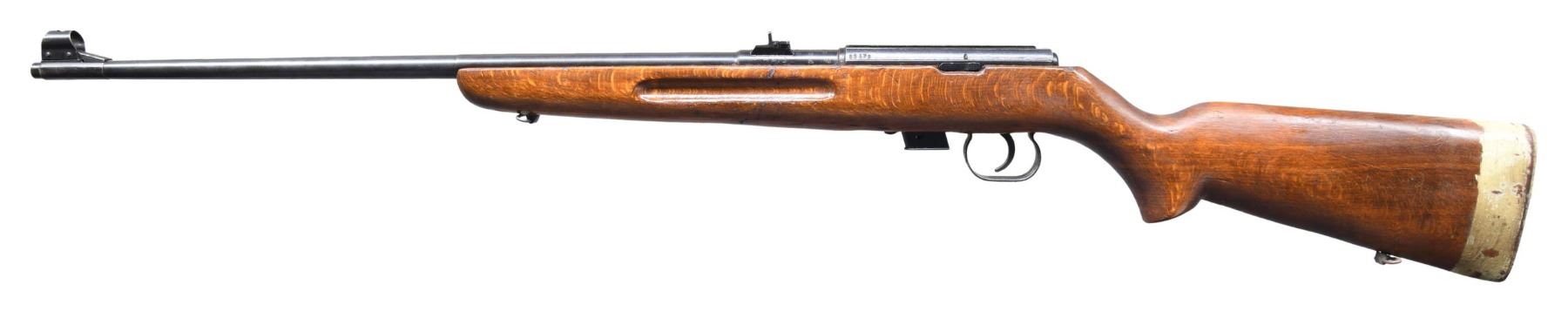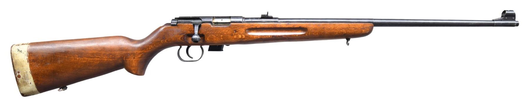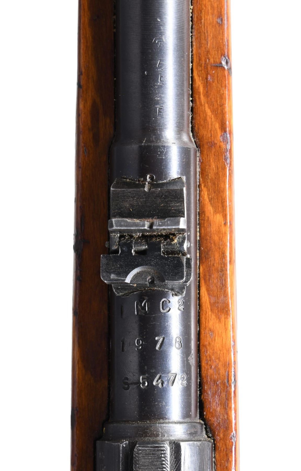 Cal. 22 LR. S# S5472. Bbl. 23 1/4". M69 bolt action training rifle mfg. in Romania and imported by Century Arms. The top of the bbl. is marked I M C 2/ 1978/ S-5472" towards the breech, with a Century Arms' import mark present on the right, and various Romanian proofs present overall. Metal components exhibit a blue finish overall. Plain wood pistol grip stock, with grasping grooves and flat plain steel buttplate, featuring a spring loaded trap door. Buttstock exhibits a band of white paint at the rear. Ramped and hooded post front sight, with dovetailed 3-leaf rear sight, graduated 20, 50, and 100. Matching numbers are present on the receiver and bbl. Bolt is mismatched. MAGS: 1 aftermarket Taiwan mfg. 5-rd. CONDITION: metal components retain the majority of their original blue finish, exhibiting some areas of light wear and thinning, some scattered spots of light surface oxidation, as well as some superficial handling marks overall. Mirror bore, exhibiting what appears to be a band and/or bulge towards the muzzle, while retaining well defined rifling throughout. Stock shows scattered marks and impressions from handling and storage, with scattered flaking on the painted white band. (25-2063/MLW). MODERN. $150-250.