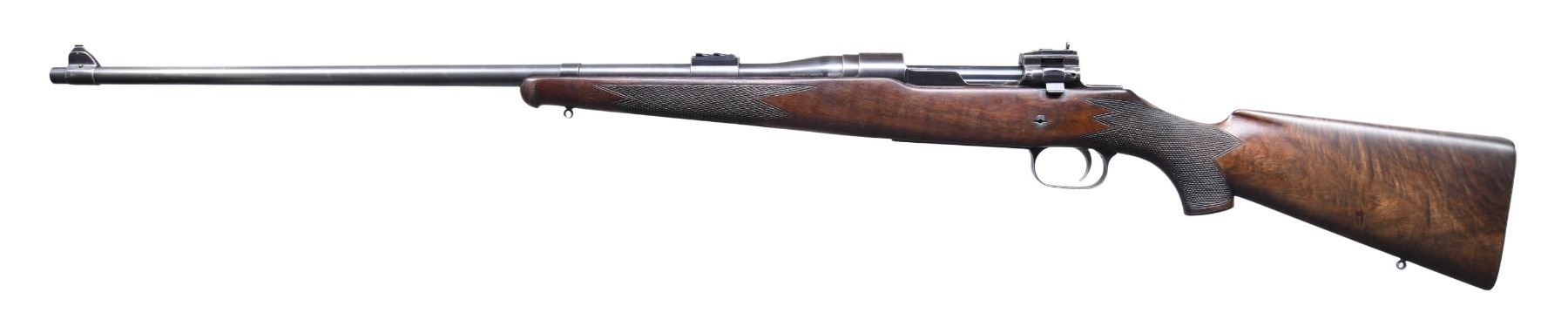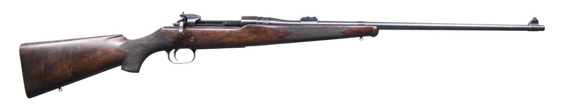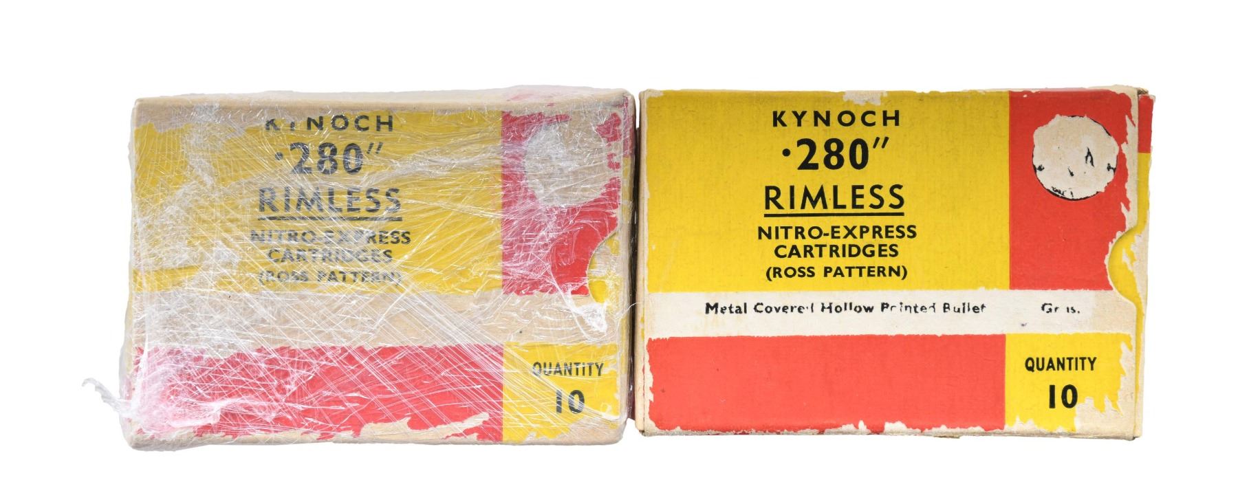 SPORTING RIFLE WITH 2 BOXES OF AMMO. Cal. 280 Ross. S# 16377. The tapered 26" barrel has band mounted blade front sight, 2 leaf express 500 yard island rear sight & Porter flip up aperture receiver sight. Ross straight pull military action with 4 shot box magazine. Checkered walnut Sporter stock with schnable tip, sling eyes, checkered hard rubber grip cap & checkered steel buttplate. UNATTACHED ACCESSORIES: 2 Boxes of Kynoch 280 Rimless NE hollow point ammo. Boxes are protected by cellophane. CONDITION: good fading blue on most metal parts showing cycling wear, occasional spots of patina & light handling marks. Very good wood finish with handling marks & some flattened diamonds. Shiny bore with strong rifling & light fouling. (24-6952/MD). CURIO.$800-1,200.