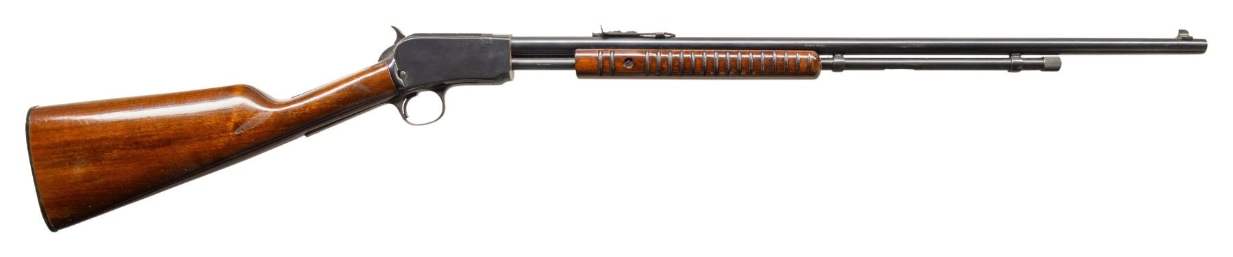 1) ROSSI 62 SA PUMP ACTION. Cal. 22 S, L, LR. S# G123530. Bbl. 23". Blade front sight & elevator rear sight. Tubular mag. Hardwood stock set. CONDITION: good blue with cycling wear & marks. Tang screw is missing. Good wood finish with marks. Very good rifling. (25-5876/MD)