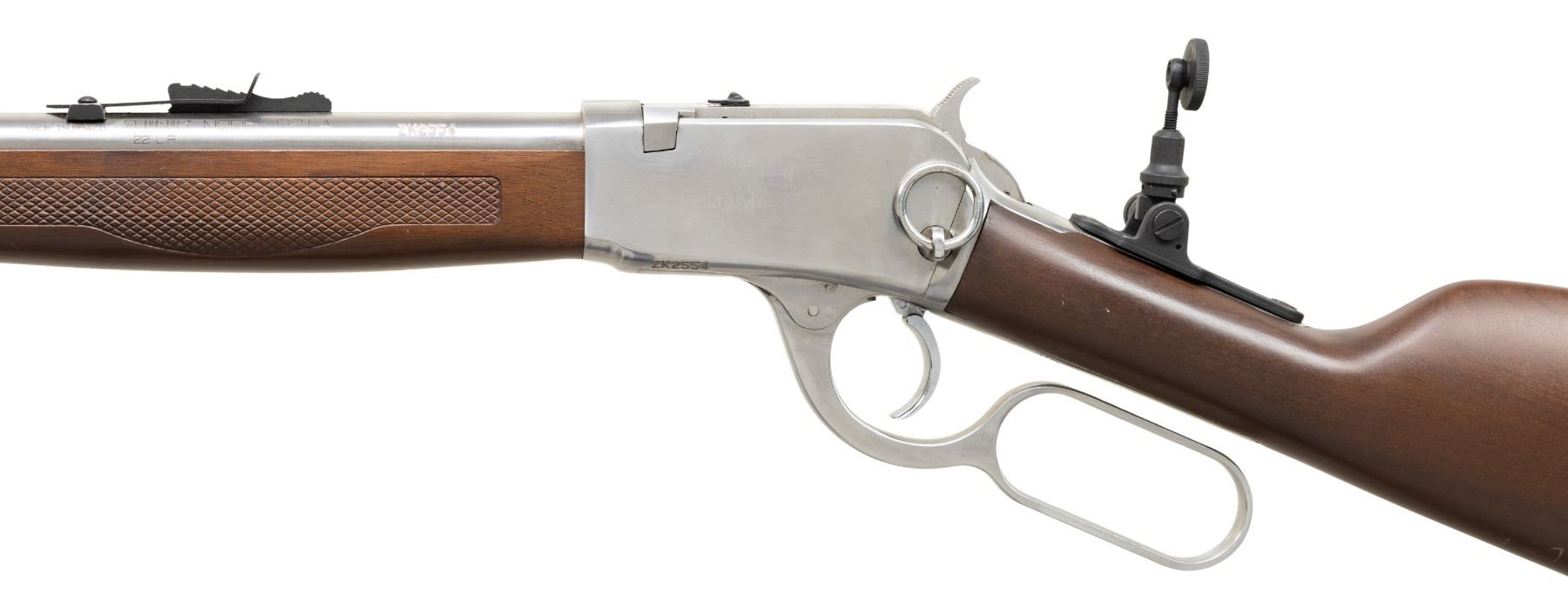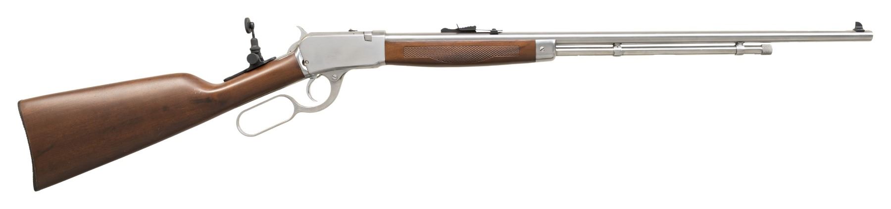 2) TAURUS MODEL 62LA STAINLESS. CAL. 22 LR. S# ZK2554. Bbl. 23". Sporting iron sights along with Taurus tang sight. Tubular mag. Breech block has safety. Hardwood stock set. CONDITION: very good stainless finish. Very good wood finish with deep marks. Very good rifling. PROVENANCE: From the PMRB Collection. (25-5973/MD). ALL MODERN. $500-800.