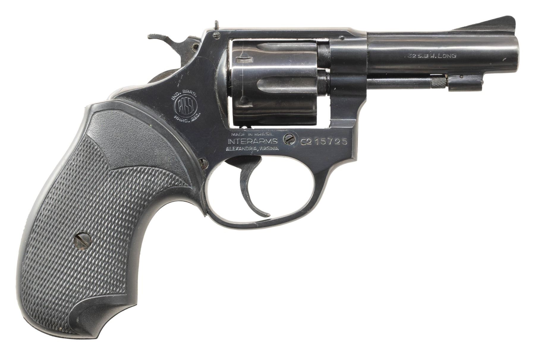 Cal. 32 S&W Long. S# C215725. Bbl. 3" pinned. Ramped serrated blade front sight. Square notch rear sight. 6-shot cyl. Interarms import marking on right side of frame. Blued finish. Pachmayr Compac grips. CONDITION: grips show some handling marks & scuffing. Metal retains 97% original blue with some edge wear, handling marks & a couple spots of oxidation. Action functions properly when hand cycled. Bright near excellent bore. PROVENANCE: Estate of Groves Herrick. (25-5702/MJC). MODERN. $100-300.