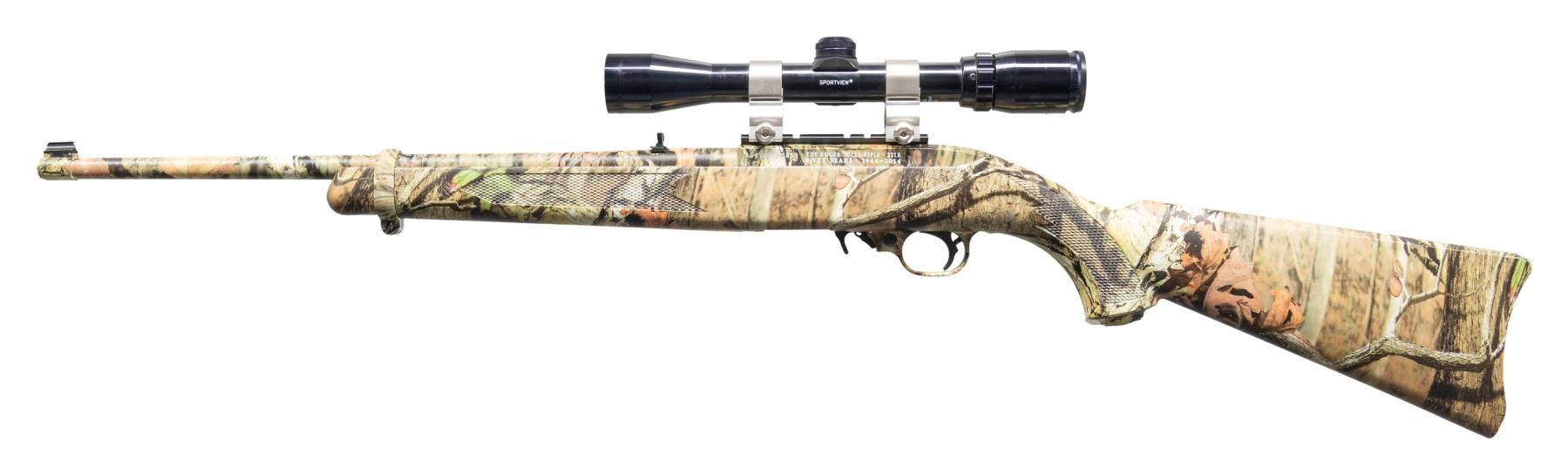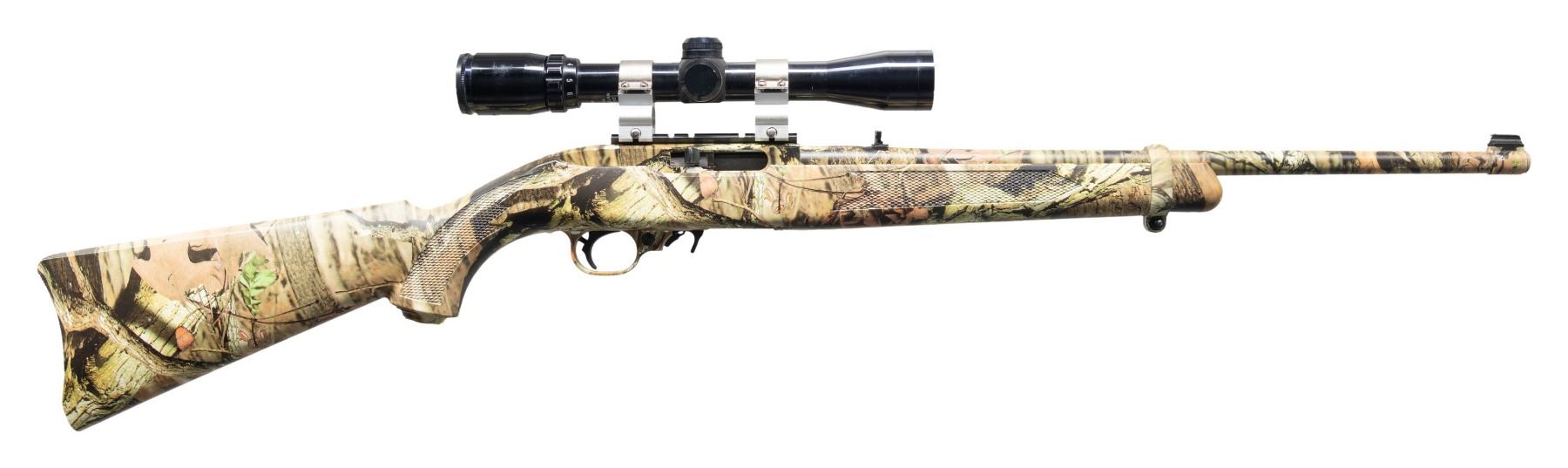 SEMI AUTO RIFLE WITH MATCHING FACTORY BOX. Cal. 22 LR. S# 0001-05851. Bbl. 18.5". Gold bead front sight & folding rear sight. Rifle has completed coverage of Mossy Oak Infinite camoflauge pattern. Bushnell Sportview 3-9x32 scope on Weaver see through rings & Weaver style base. Synthetic stock. MAGS: NONE. UNATTACHED ACCESSORIES: box with paperwork & lock. CONDITION: all aspects of rifle appear near excellent with oxidation on extractor. Scope has very good finish with serviceable optics. (25-3931/MD). MODERN. $200-300.