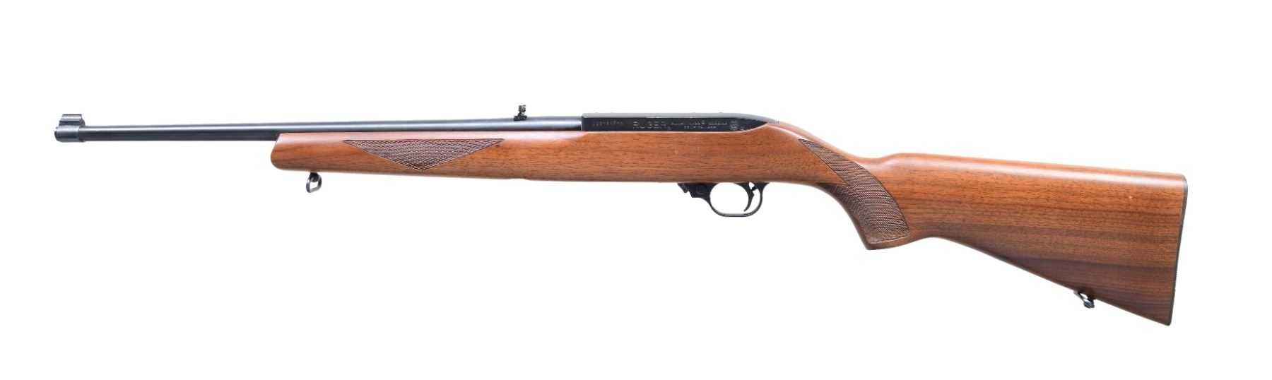 Cal. 22 LR. S# 128-60268. Bbl. 18 1/2" w/ band fastened bead front sight & folding leaf rear sight. Black finished alloy action is drilled for scope attachment. Pistol grip walnut sporter stock w/ cut checkering, sling swivels & original buttplate. 1988 Mfg. MAGS: NONE. CONDITION: over 98% wood & metal finish showing a few sm. handling marks. Bright bore w/ sharp rifling. (24-6530/DS). MODERN. $200-300.