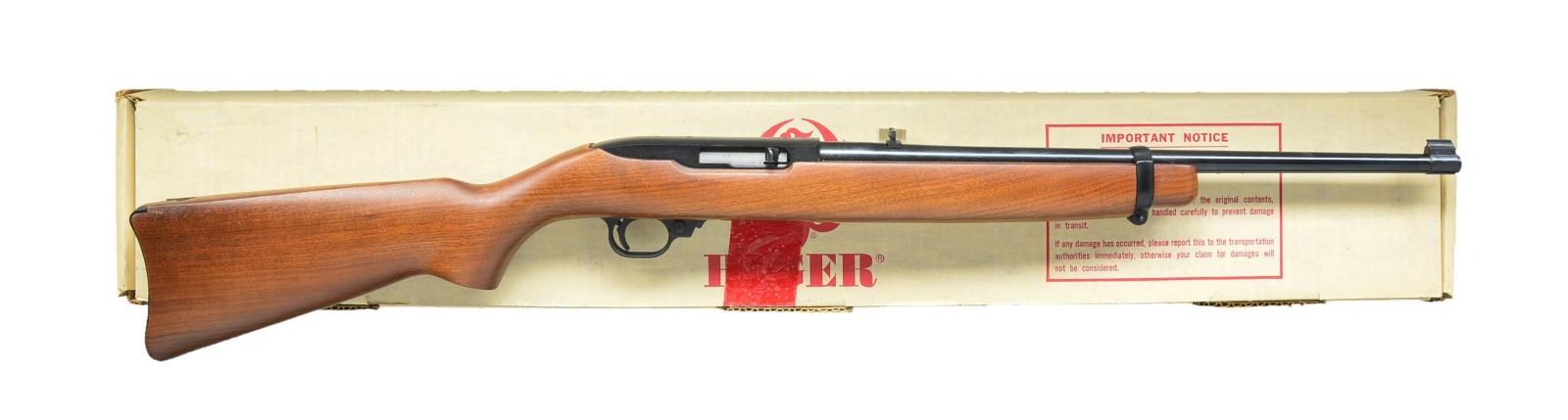 Cal. 22 LR. S# 115-54555. Bbl. 18 1/2" w/ bead front sight & folding leaf rear sight. Left side of bbl. marked "MADE IN THE 200TH YEAR OF AMERICAN LIBERTY". Walnut carbine stock. MAGS: 1 detachable 10 rd. rotary mag. UNATTACHED ACCESSORIES: original box containing instruction pamphlet. CONDITION: near new w/ original box. (21-2930/DS). MODERN. $250-350.