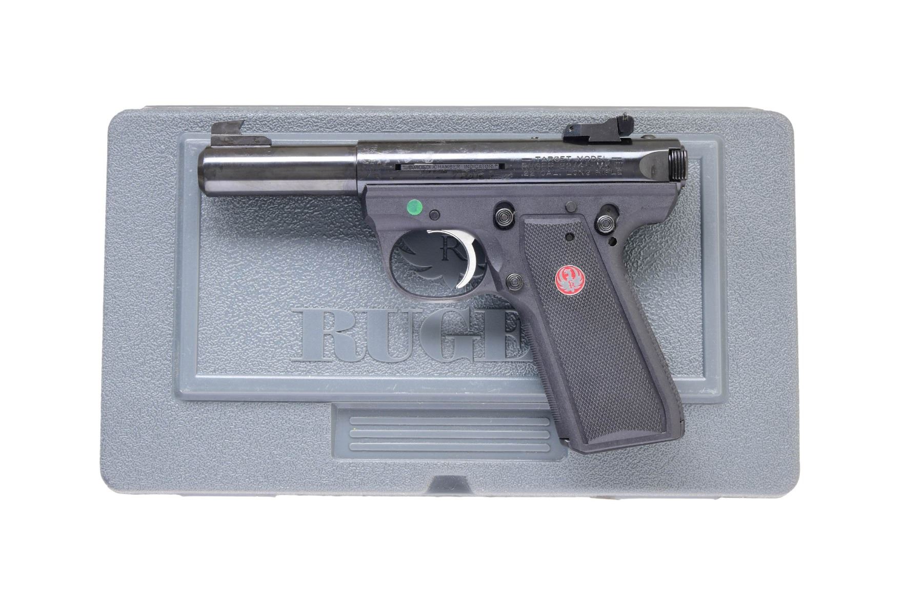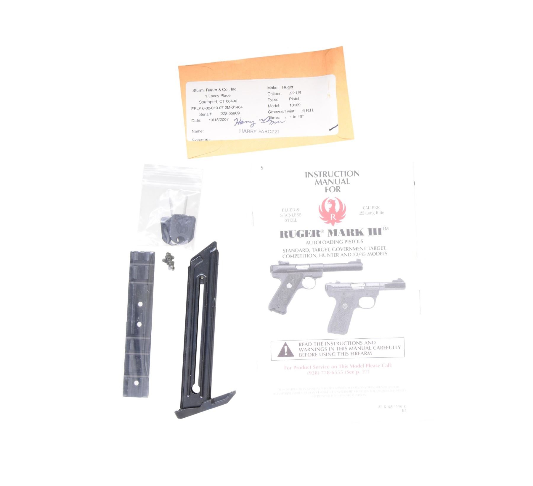 Cal. 22 LR S# 228-55909. Manufactured with a blued finish and a 5.5-inch barrel. Features fixed front and rear sights. The frame includes a left-side safety and magazine release. Checkered polymer grips. MAGS: 2-10 Rds. UNATTACHED ACCESSORIES: Factory box, owner's manual, and additional rail. CONDITION: Overall near excellent with approximately 95% of the finish remaining. Bore is clean with strong rifling. PROVENANCE: Lifelong Collection of Terrence McCarty. MODERN (24-61/MD) $200-$400