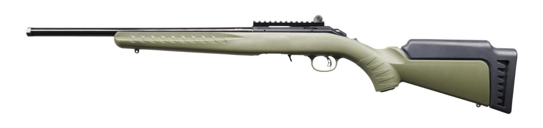 Cal. 22 LR. S# 835-65220. Bbl. 18" hammer forged without provision for sights; threaded 1/2"–28 for accessories; attached thread protector. Mfg. 2021 (2013 to date) in Mayodan, NC, as Model 08334; exclusive to The Shooting Store. Olive-drab synthetic stock with sling studs plus high interchangeable buttstock module for better cheek weld with scope use; will accept other modules available from Ruger. Convenient tang safety, safety blade trigger, extended magazine release, and 60-degree bolt throw for scope clearance. Receiver grooved for 3/8" scope mounting plus drilled and tapped for Weaver #12 scope bases; factory installed 1 piece Picatinny base. MAGS: 1 factory 10 rd.; will accept all 10/22 mags. UNATTACHED ACCESSORIES: original box and packaging. CONDITION: all aspects near excellent appearing new and unfired. PROVENANCE: the Collection of Gun Sport Ltd. owned by Jon R. Thomas. (23-3526/NW). MODERN. $250-350.