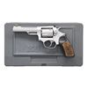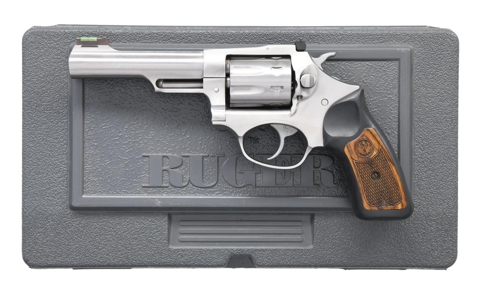 Cal. 22 LR. S# 577-21873. Bbl. 4.2" with grooved, solid rib having dovetailed, green fiber optic sight; frame mounted adjustable rear. Mfg. 2014 in Newport, NH as Model 05765; KSP-242-8. Cushioned rubber grip with laminated hardwood inserts having laser engraved checkering and logo. Fluted 8-round cylinder and matte stainless finish throughout. UNATTACHED ACCESSORIES: factory gray plastic case; no packaging. CONDITION: faint traces of firing residue and very slight cylinder turn line; all other aspects near excellent, including bore and grips. (24-13/NW). MODERN. $500-750.