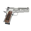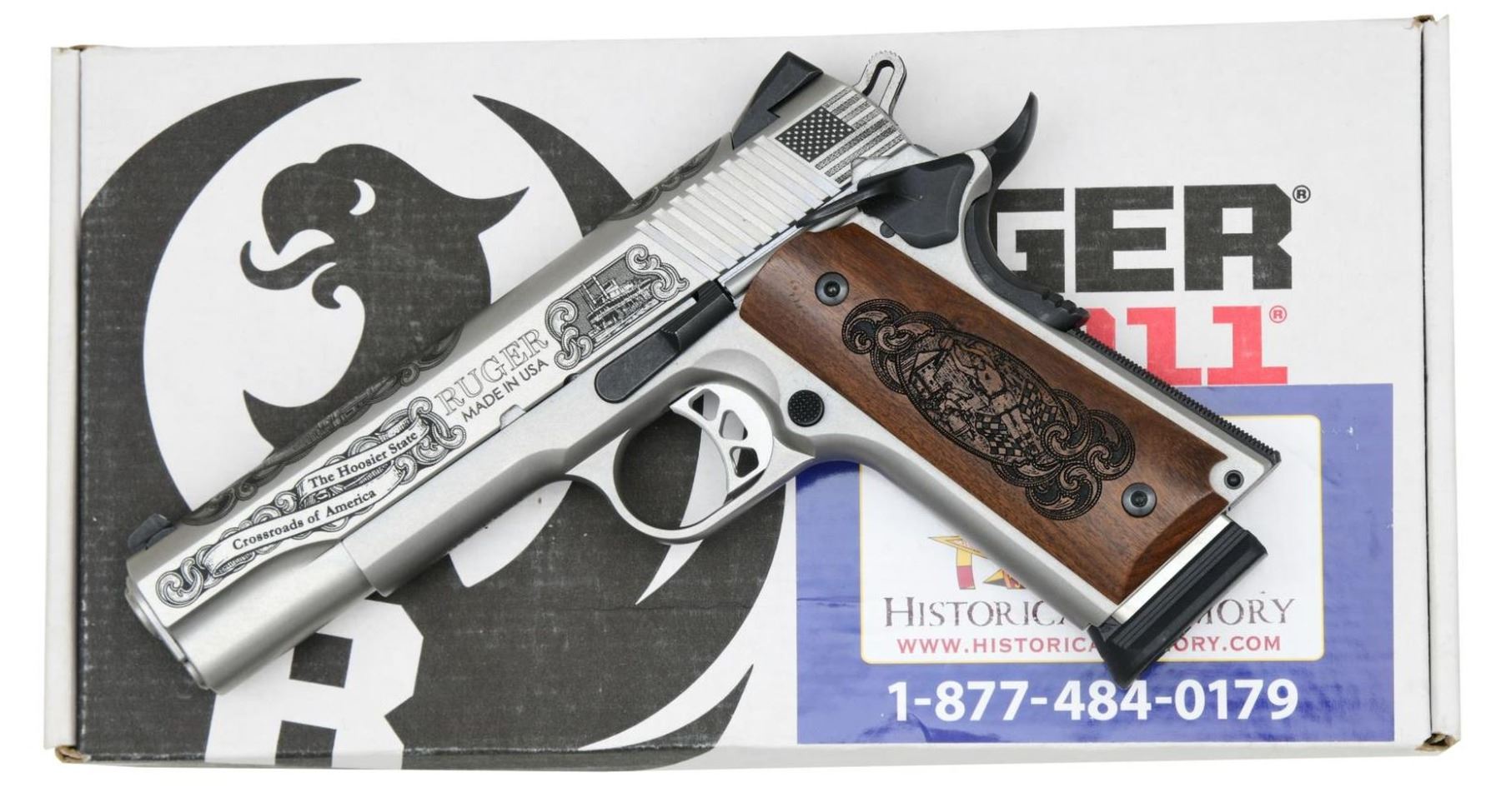 SEMI-AUTO PISTOL. Cal. 45 ACP. S# 672-42131. Bbl. 5" throated stainless with chamber inspection port. Mfg. 2016 (2011 to date for all SR1911's) as Model 06700 in Prescott, AZ, with distinctive gray-toned machine engraving honoring the Hoosier state with a steamboat vignette, banners, and the American flag on the left rear of the slide. Top of the slide behind the ejection port has "24 of 100"; the front has a state capitol vignette. Laser-engraved walnut grips (retained by Allen head screws), honoring the state's prowess in basketball plus the Indianapolis 500. Standard enhanced Ruger features include an integral plunger tube, an enlarged and flared ejection port, an extended magazine release, a silver skeletonized trigger with overtravel adjustment, a black flat checkered mainspring housing, a black stylized beavertail grip safety with memory pad, a skeletonized hammer, a flared magazine well, and extended thumb safety. Slide has dovetailed 3-dot sight set (windage adjustable rear) and slanted square-cut cocking grooves. MAGS: 2 factory stainless TOTAL; 8 rd. with push button black plastic bumper pad and 7 rd. with standard flat integral base drilled and tapped for bumper. UNATTACHED ACCESSORIES: matching numbered factory box with packaging to include original Ruger laminated hardwood checkered double diamond grips with silver eagle medallions plus Historical Armory sticker on box lid. CONDITION: all aspects are near excellent, appearing new and unfired. (23-6923/NW). MODERN. $600-900.