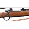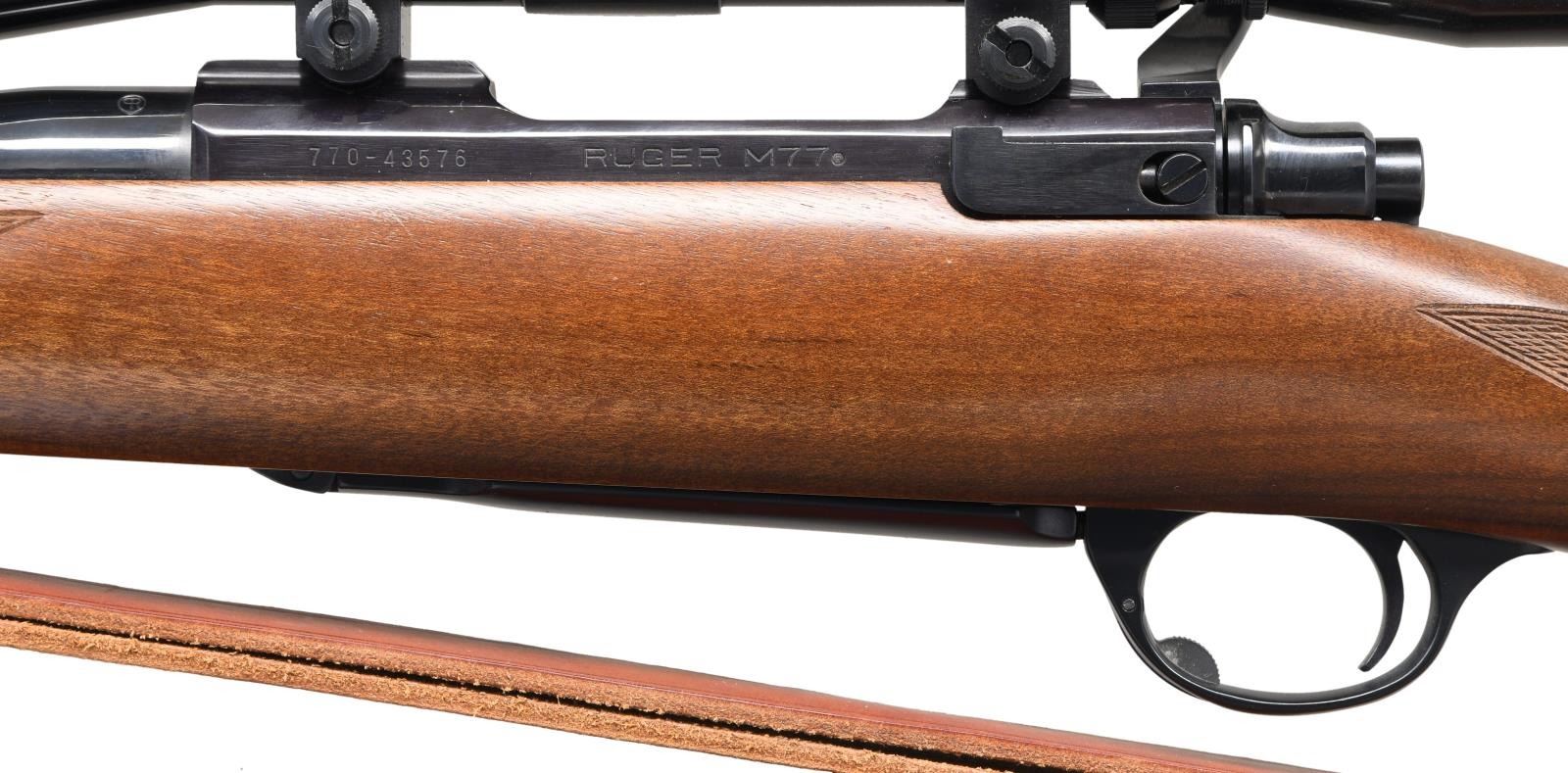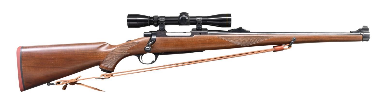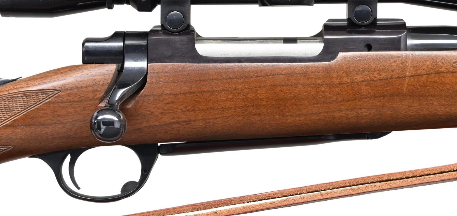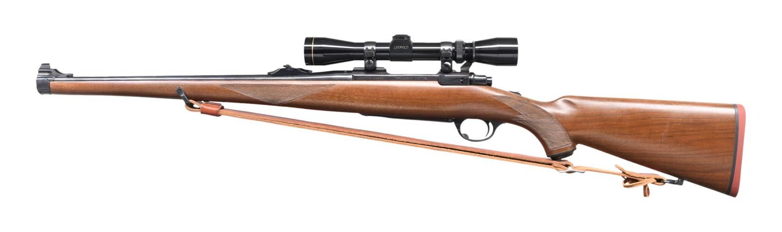 ACTION RIFLE. Cal. 250 Savage. S# 770-43576. Bbl. 18 1/2" with banded (easy user changeability) brass bead front sight plus folding leaf on short rib at rear. Mfg. 1992 (1968-1992 with tang safety) as short action Model 00769 with checkered walnut mannlicher stock having red pad, grip cap and sling swivels plus brown leather sporting sling. Scarce, desirable caliber with references indicating 770-15504 as highest number known. Factory scope rings with gloss finished Leupold 2X7 Vari-X IIc scope having Duplex reticle. CONDITION: some very light handling marks on stock, but overall near excellent to include metal finish, bore and scope set. PROVENANCE: from The Collection of Gun Sport Ltd. Owned by Jon R. Thomas. (23-4644/NW). MODERN. $800-1,200.