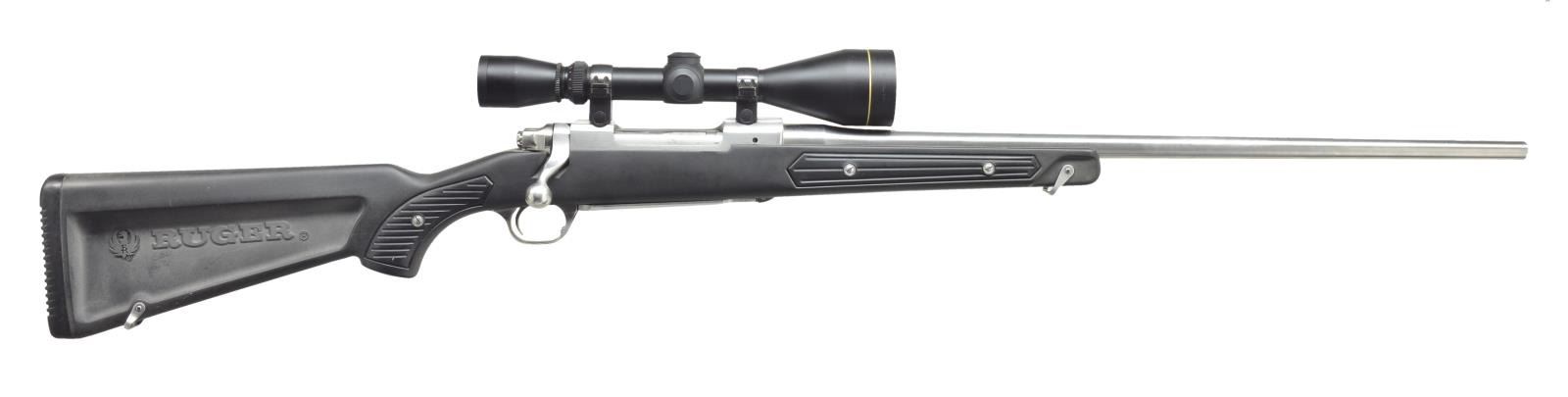 RIFLE. Cal. 338/300. S# 781-99278. Bbl. unmarked custom 23 3/8" stainless w/ no sight provisions & standard sporting crown. Often referred to as 338 Patriot cal. Only true advantage over Win. 300 or 338 Mag. is slight increase in case capacity allowing 300 gr. bullets a bit more velocity. Originally mfg. 1993 in 338 Win. Mag. as Model # 07860. Stainless w/ Ruger black plastic stock having recessed panels in butt plus black grooved panel inserts for pistol grip & forend. Blued Ruger rings & Leupold matte finished 3-9X 50 VARI-X IIc scope w/ duplex reticle. UNATTACHED ACCESSORIES: RCBS die set labeled 338 Win. containing seater, FL sizer, neck sizer & extra decapper / expander. Likely regular dies dimensionally changed to match chamber. CONDITION: recessed panels of butt w/ cloudy appearance & occasional light mark on stock set. All other aspects near excellent including bore, scope exterior & optics. (21-1628/NW). MODERN. $550-800.