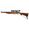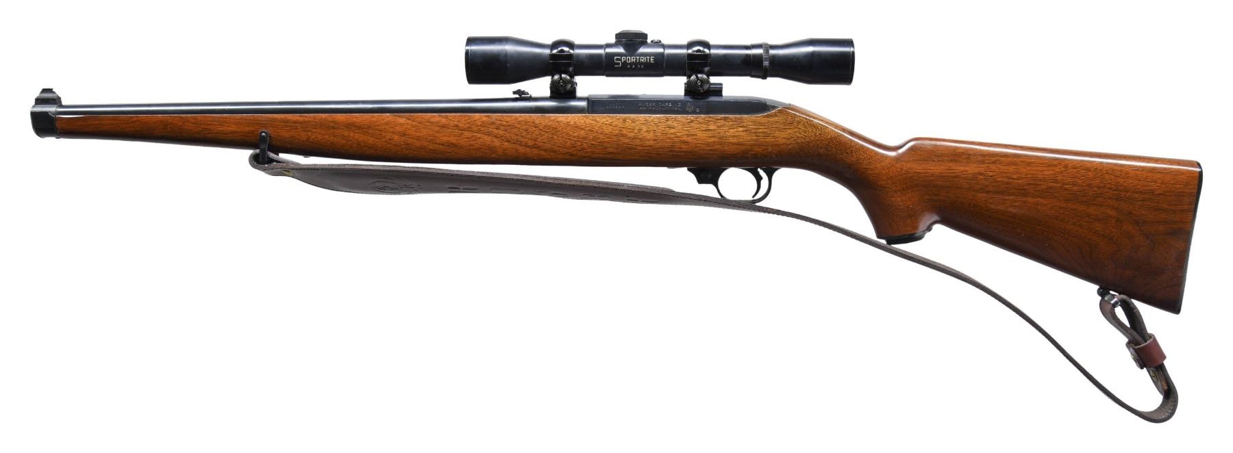 Cal. 44 Mag. S# 122211. Bbl. 18 1/2" with banded brass bead front sight and folding leaf rear; has "INC." in address. Mfg. 1967 (1966-1967 for Mannlicher; 1961-1985 for all 44's) as Model 44X indicating uncheckered Mannlicher stock; approx. 3,700 units produced. Has 4 rd. internal magazine with button release at loading gate. Alloy cartridge guide properly screw attached to receiver; later models were steel and riveted to the receiver. Fitted with cobra style leather sling having Ruger logo. Vintage Sportrite 4X32 cross wire reticle (non centered) matte finished scope in economy alloy scope rings. CONDITION: very good appearance with stock having extra finish added with some going over onto metal finish plus some very light handling marks. Metal finish is very good to excellent with light high point wear on nose cap of stock plus light function wear by ejection port. Bore and optics are near excellent. Very desirable 44 Carbine. (25-5134/NW). CURIO. $800-1,200.