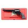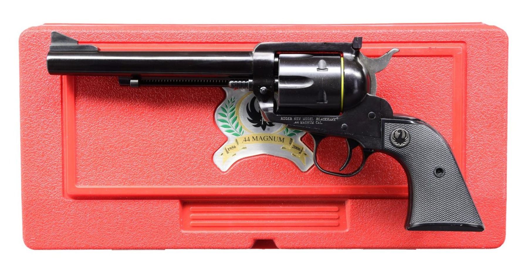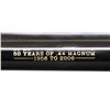 Cal. 44 Mag. S# 870-04698. Bbl. 6 1/2" with ramped serrated blade sight plus Micro frame mounted adjustable rear. Top of barrel has "50 YEARS OF 44 MAGNUM" and "1956-2006". Mfg. 2006 (2006-2008; approx. 17,000 units) with blued finish plus steel grip frame and ejector housing giving weight and feel of early frontier SA revolver. New sized grip frame to replicate the original having checkered black plastic grips with black eagle medallions. UNATTACHED ACCESSORIES: original red plastic commemorative case with 50 year logo on lid plus factory packaging. CONDITION: all aspects near excellent with new unfired appearance. (23-6896/NW). MODERN. $900-1,300.