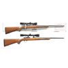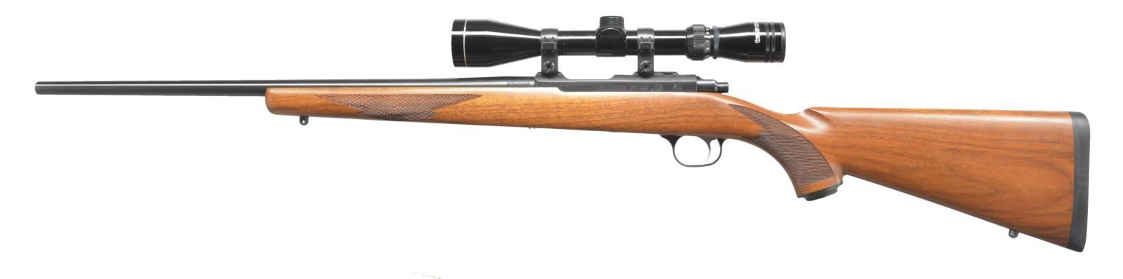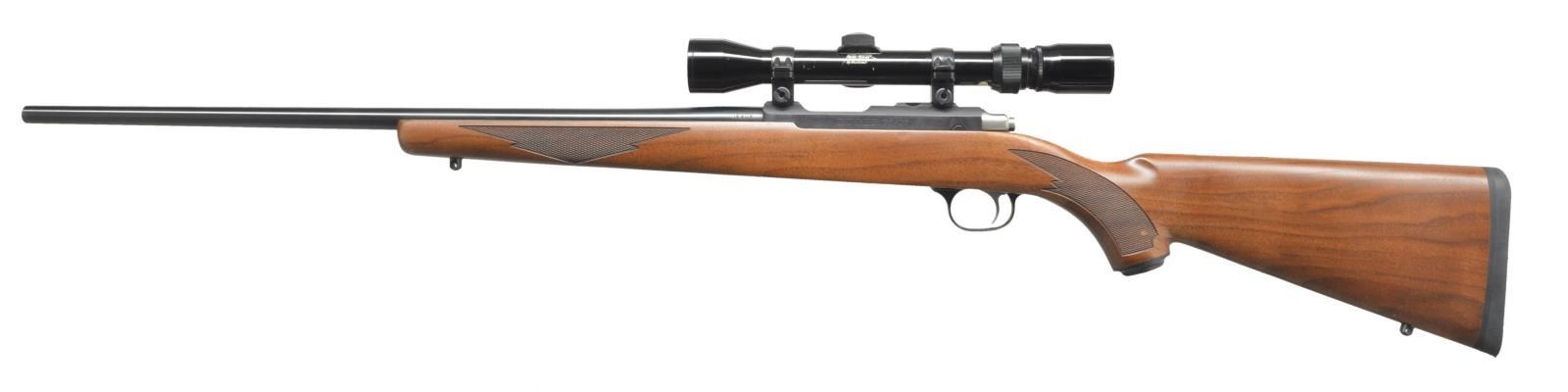 1) MODEL 77/17. Cal. 17 HMR. S# 703-05581. Bbl. 22" w/out sights. Bushnell Banner 3-8x32 gloss finished scope w/ standard crosshairs on Ruger rings & integral mts. Stainless steel bolt. Straight comb walnut sporter stock w/ cut checkering, swivel bases, plastic grip cap & solid black Ruger rifle pad. MAGS: 1 detachable 9 rd. rotary. UNATTACHED ACCESSORIES: box containing owner's manual, trigger lock & ring package. CONDITION: near excellent retaining over 99% metal finish. Original stock finish shows a few sm. handling marks. Near excellent bore. Scope has good optics. (21-404/DS). 2) MODEL 77/22. Cal. 22 Win. Mag. S# 701-11576. Bbl. 20" w/out sights. Tasco 3-12x40 gloss finished scope w/ duplex reticle on Ruger rings & integral bases. Blue finish. Straight comb walnut sporter stock w/ cut checkering, swivel bases, plastic grip cap & Ruger solid black rifle pad. MAGS: 1 detachable 9 rd. rotary. CONDITION: 97% blue showing bolt knob wear. Original stock finish shows a few scattered scratches & marks. Bright bore w/ strong rifling. Scope has good optics. (21-457/DS). BOTH MODERN. $1,000-1,400.