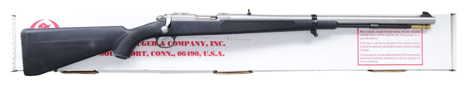 Cal. 50. S# 730-17665. Bbl. 22". Gold bead front sight. Flip up rear sight. Integral scope bases. Ruger catalog # K77/50-RSP & Model 07305 stainless 77/50 muzzleloading rifle. Stainless finish. black synthetic pistol grip stock with bottom mounted sling studs. UNATTACHED ACCESSORIES: matching numbered factory box with manual, factory trigger lock & set of stainless factory rings. CONDITION: all aspects near excellent. (01-26030/MJC). ANTIQUE. $300-500.