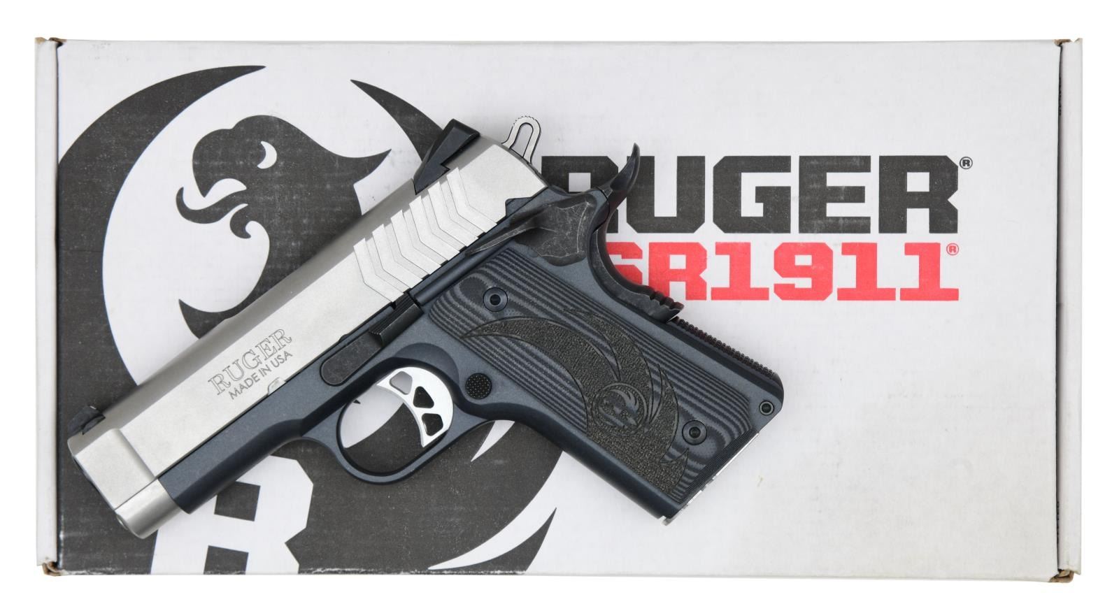 AUTO PISTOL. Cal. 9mm Luger. S# 673-06643. Bbl. 3.6" bushingless ramped stainless with chamber inspection port plus lightly flared and enlarged ejection port. 1 of 250 limited edition from Davidsons. Mfg. 2018 (2011 to date for all SR1911's) as Model 06758 in Prescott, AZ, with low-glare stainless slide having square cut chevron cocking grooves plus matte black accents on Tungsten Cerakoted frame. Dovetailed 3-dot sights have a windage-adjustable Novak-style rear. Laminated gray hardwood grips with a laser-engraved Ruger logo are retained by Allen head screws. Standard enhanced Ruger features include an integral plunger tube, an extended magazine release, a full-length guide rod, a silver skeletonized trigger with overtravel adjustment, a titanium firing pin for faster lock time, a black flat checkered mainspring housing (beveled at the rear), a black stylized beavertail grip safety with memory pad, a skeletonized hammer, a flared magazine well, and extended thumb safety. The slide front has a reduced width, like a Hi-Power. MAGS: 2 factory stainless 7 rd. with standard flat integral bases drilled and tapped for bumpers. UNATTACHED ACCESSORIES: matching numbered factory box with packaging. CONDITION: all aspects are near excellent, appearing new and unfired. (23-6894/NW). MODERN. $800-1,100.