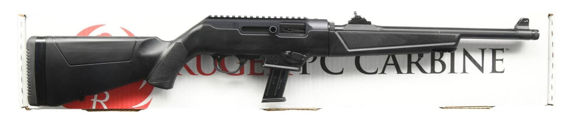 Cal. 9mm Luger. S# 912-47331. Bbl. 16.12" fluted and threaded 1/2"-28 (with thread protector) having protected blade sight; ghost ring adjustable rear on receiver. Mfg. 2021 as PC (Pistol Caliber) takedown variant with alloy receiver having integral Picatinny rail for optics mounting. Black synthetic stock with sling provisions, textured grip panels, soft recoil pad and spacers to change LOP. Model 19110 with MSRP of $779. Interchangeable magazine well allowing use of Glock magazines, reversible magazine latch, dead blow function with tungsten weight allowing short cycling action plus trigger group uses standard 10/22 components. MAGS: 1 factory 17 rd. SR, Security-9 type. UNATTACHED ACCESSORIES: matching numbered factory box and packaging to include Glock mag. well adapter. CONDITION: all aspects near excellent (including bore); appears new and unfired. PROVENANCE: The Collection of Gun Sport Ltd. owned by Jon R. Thomas. (23-3478/NW). MODERN. $450-600.
