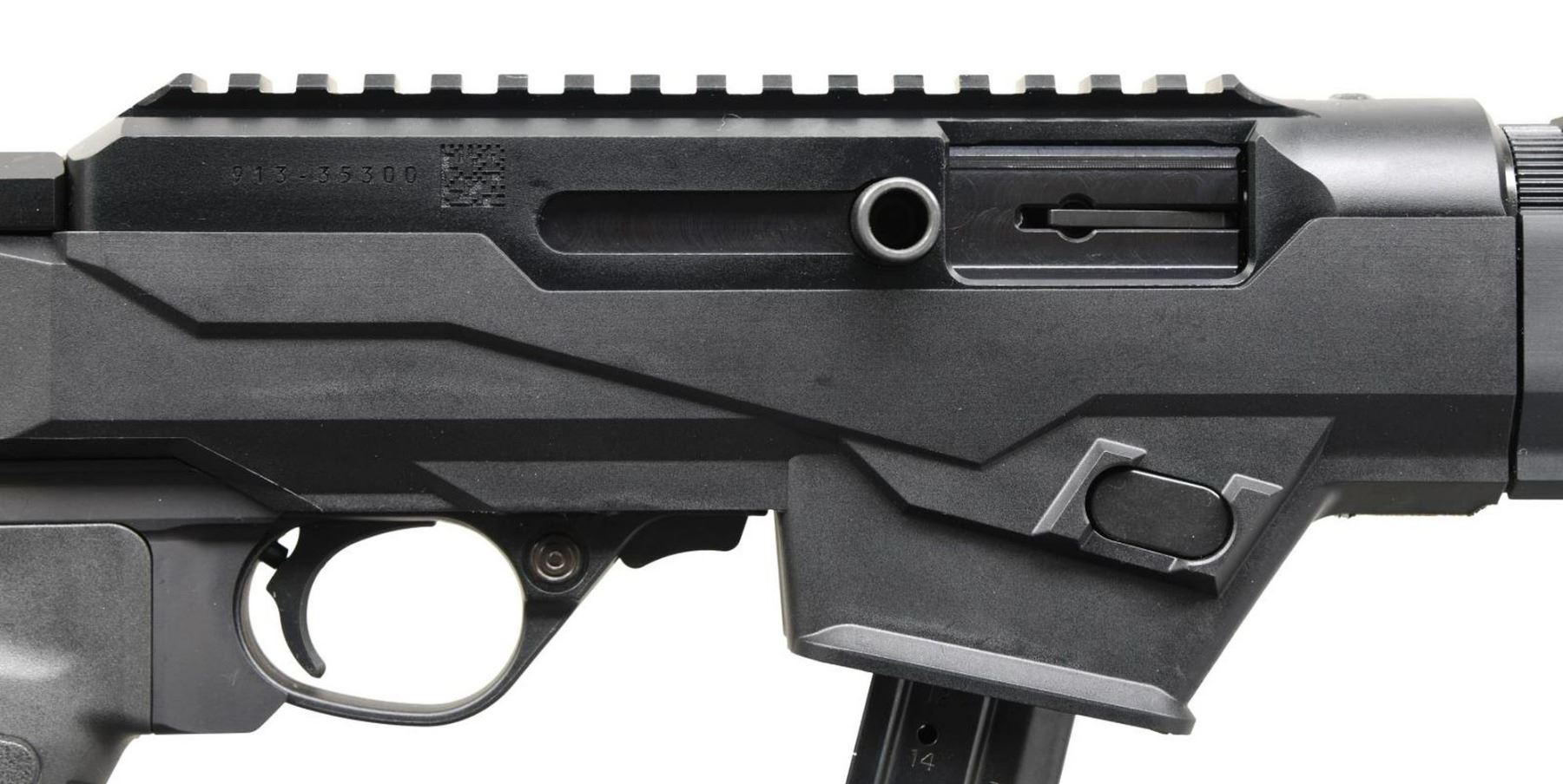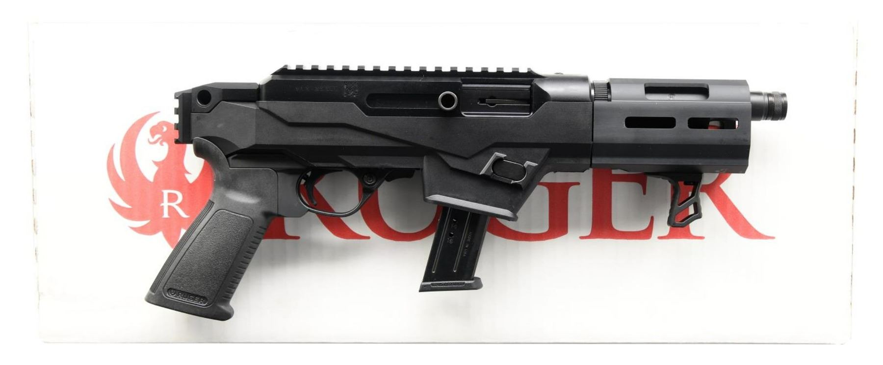 Cal. 9mm Luger. S# 913-35300. Bbl. 6.5" threaded 1/2"-28 with thread protector. Mfg. 2021 as PC (Pistol Caliber) takedown variant secured in polymer chassis having anodized alloy handguard with factory installed hand stop at 6 o'clock position plus M-Lok slots for accessory attachments. Model 29100 with MSRP of $899. Integral flared magazine well, integral Picatinny rail for sight installations, QD cups for detachable sling attachment at rear, reversible magazine latch plus accepts standard AR grips. MAGS: 1 factory 17 rd. SR, Security-9 type. UNATTACHED ACCESSORIES: matching numbered factory box and packaging. CONDITION: all aspects near excellent (including bore); appears new and unfired. PROVENANCE: The Collection of Gun Sport Ltd owned by Jon R. Thomas.(23-2936/NW). MODERN. $450-650.