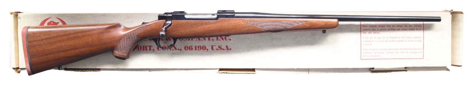 Cal. 257 Roberts. S# 72-34358. Bbl. 22" without provision for sights; marked "MADE IN THE 200th YEAR OF AMERICAN LIBERTY". Mfg. 1976 (1968-1992) with tang safety, receiver factory machined for Ruger scope rings and blued finish. Checkered walnut stock with grip cap, sling studs and red rubber butt pad. UNATTACHED ACCESSORIES: original box (split ends) with packaging to include scope rings in factory red felt bag. CONDITION: all aspects near excellent appearing new and unfired. (24-3500/NW). MODERN. $750-1,000.