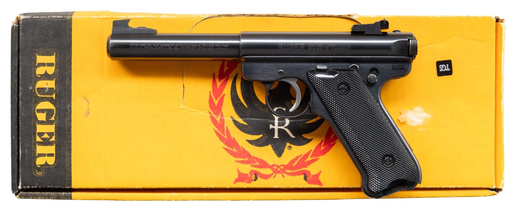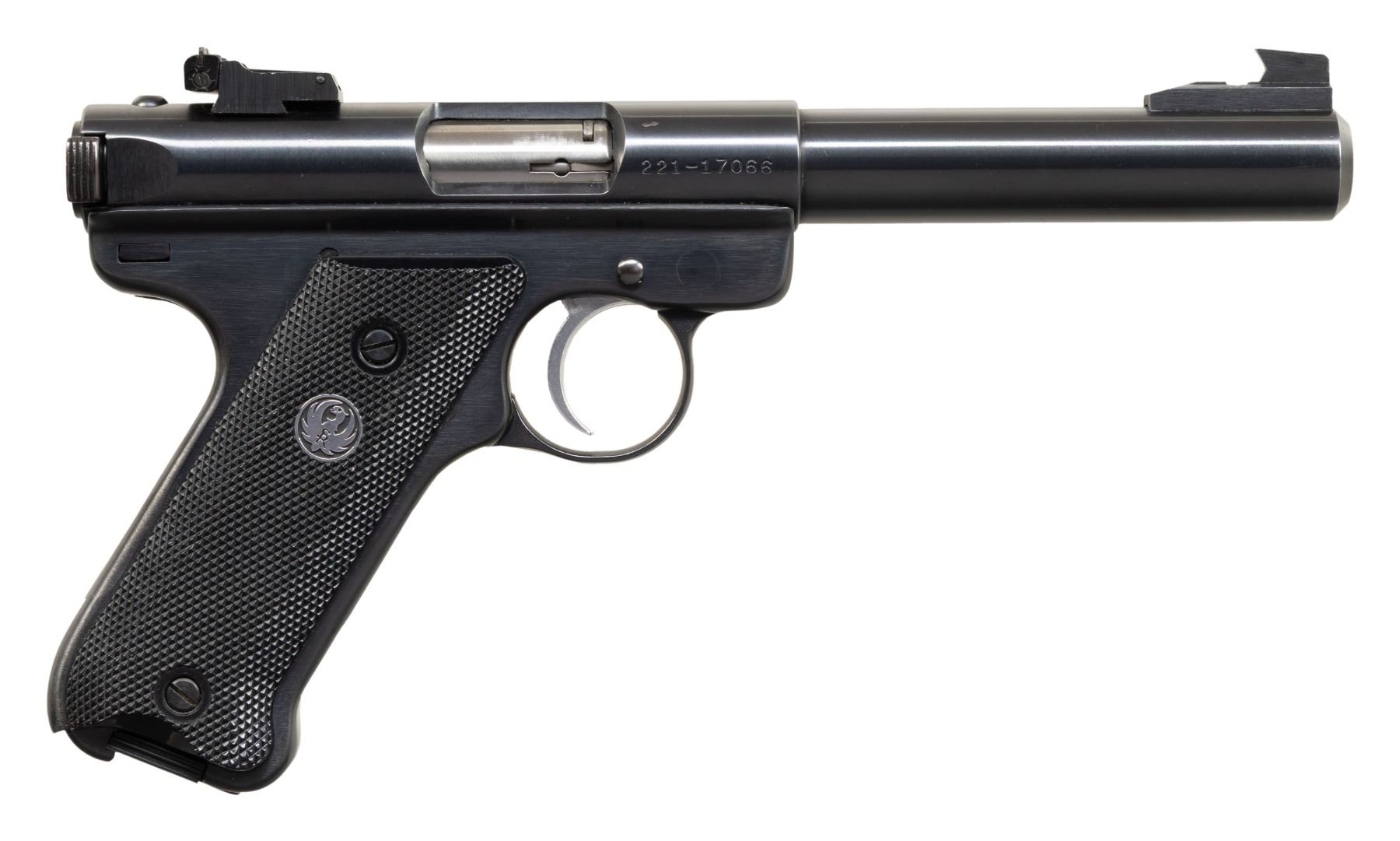 Cal. 22 LR. S# 221-17066. Bbl. 5 1/2" bull with screw attached undercut square faced target front sight; factory adjustable rear on receiver. Shipped 1994 (1982-2005) as MK512 with Model number 00172. MAGS: 2 factory 10 rd. UNATTACHED ACCESSORIES: factory box with obliterated label having what appears to be upper portion of "MK678G" plus packaging to include June 10, 1987 Ruger test target signed by J. Hleya with this pistol's serial number on it appearing all by the same pen at the same time; no plausible explanation. Government Sales Division TM MKII-678-1 manual. CONDITION: an occasional extremely faint handling mark, but generally near excellent with unfired appearance. PROVENANCE: Estate Collection of John "Jack" Dhooghe. (25-5511/NW). MODERN. $200-300.