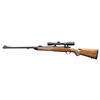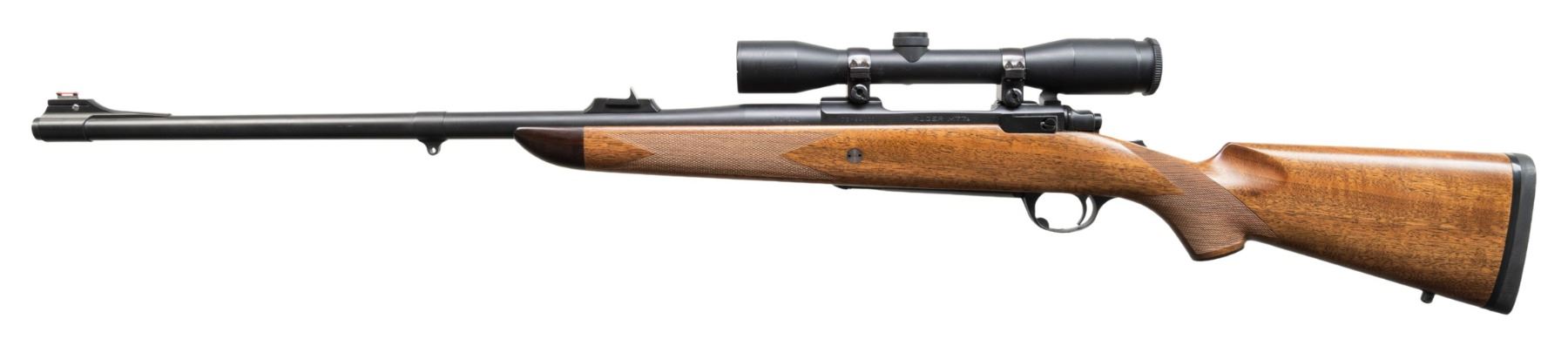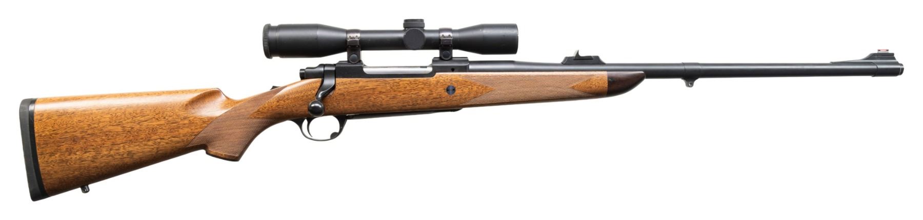AMERICAN HUNTING RIFLES, INC. Cal. 375-338. S# 73-94011. Bbl. 22" heavy sporter with 11 degree crown. Front sight is banded ramp with red fiber optic bead; rear is an ERA island base with shallow V express style sight with white vertical line on face. Tang safety action made in 1979 (1968-1992) having receiver milled for its Ruger 1" scope rings. Rebarreled, stocked and customized by American Hunting Rifle, Inc. of Corvallis, MT; company owned by author Wayne Jacobson (no longer doing custom work, parts sales only). Very fine workmanship having matte finished metal; appears Cerakoted. Caliber is 338 Winchester Magnum necked up to .375 creating a powerful, dangerous big game cartridge. Fitted with IOR Bucurest 4X32 matte finished scope with Euro fast focus eyepiece and German #3 reticle (all 3 posts are pointed). Superb, classic straight combed stock with 13" LOP over professionally fitted Decelerator black pad. Dense, straight grained walnut stock with fine 4 panel checkering. Rosewood grip cap and forend tip plus detachable swivel bases (front is barrel band) and stock reinforcement bolt. CONDITION: very light marks on scope tube exterior and 2 rub marks on barrel just forward of barrel band. Thinning of finish on front edges of front sight band. Stock has a few extremely faint marks on left side at action area. Balance of rifle is near excellent to include bore and optics. PROVENANCE: From the Buckstix Collection.(25-6368/NW). MODERN. $1,750-2,250.
