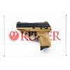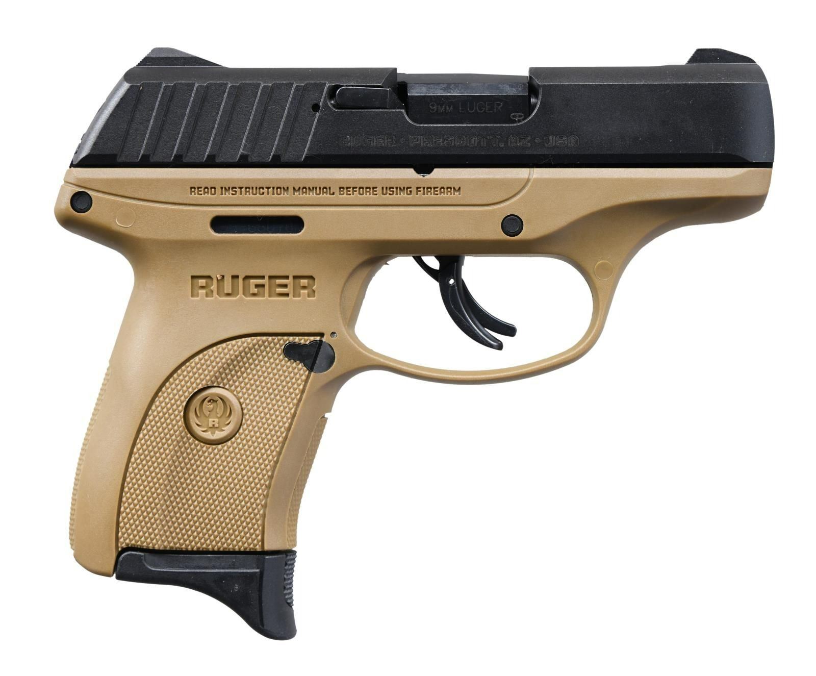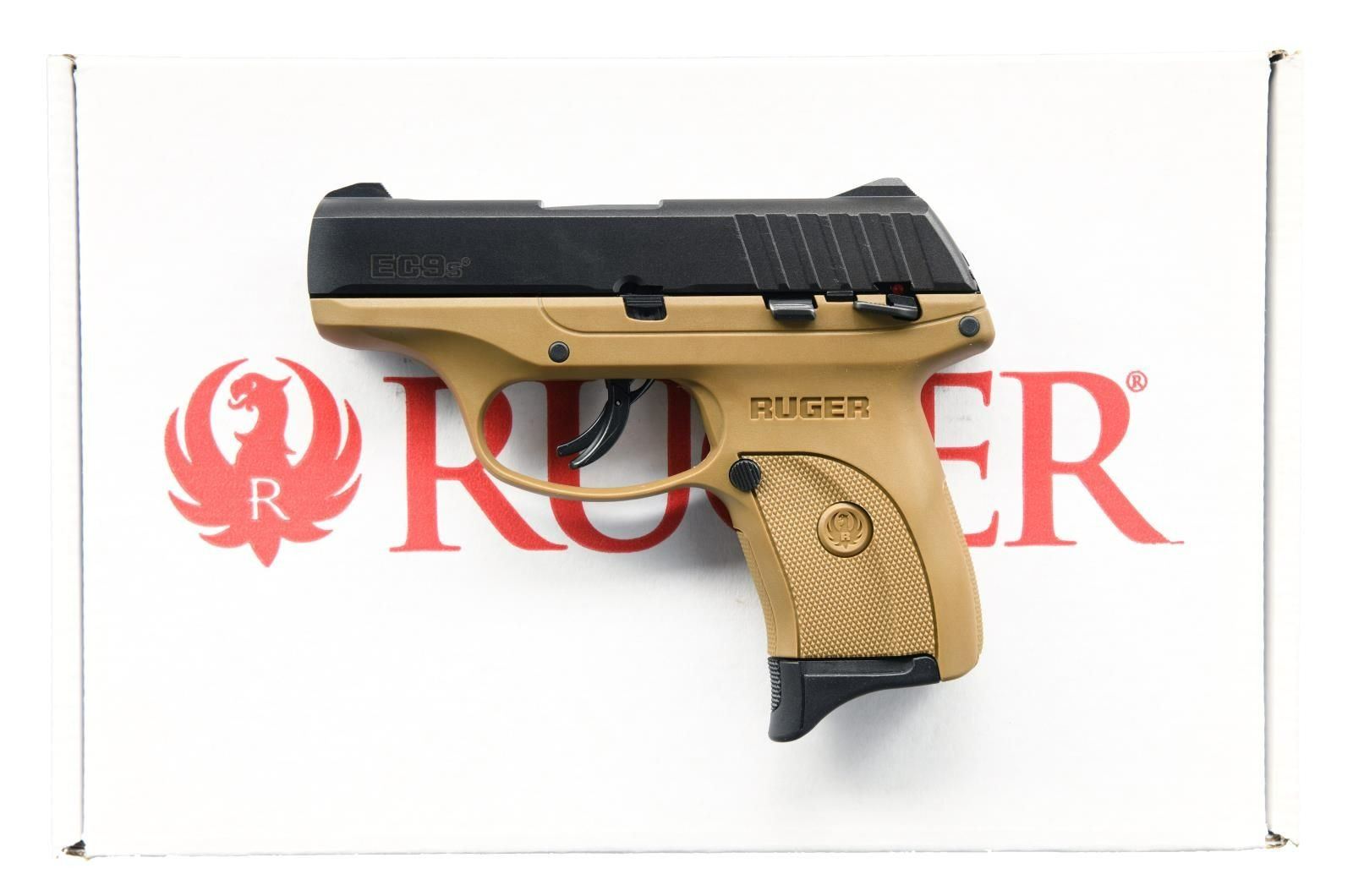 Cal. 9mm Luger. S# 459-66078. Bbl. 3.12". Mfg. 2019 with Flat Dark Earth (FDE) polymer frame having checkered gripping areas. Striker fired; multiple safety features including: integrated trigger safety, magazine safety, manual safety plus loaded chamber inspection port. Popular personal defense, concealed carry pistol barely larger than Ruger's LCP 380 ACP model yet chambered for readily available 9mm Luger ammo; MSRP of $369. MAGS: 1 factory 7 rd. with finger extension. UNATTACHED ACCESSORIES: matching factory box with packaging. CONDITION: all aspects near excellent including bore; appears new and unfired. PROVENANCE: The Collection of Gun Sport Ltd owned by Jon R. Thomas. (23-2928/NW). MODERN. $250-350.