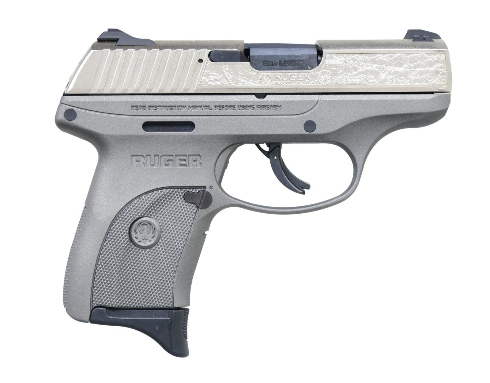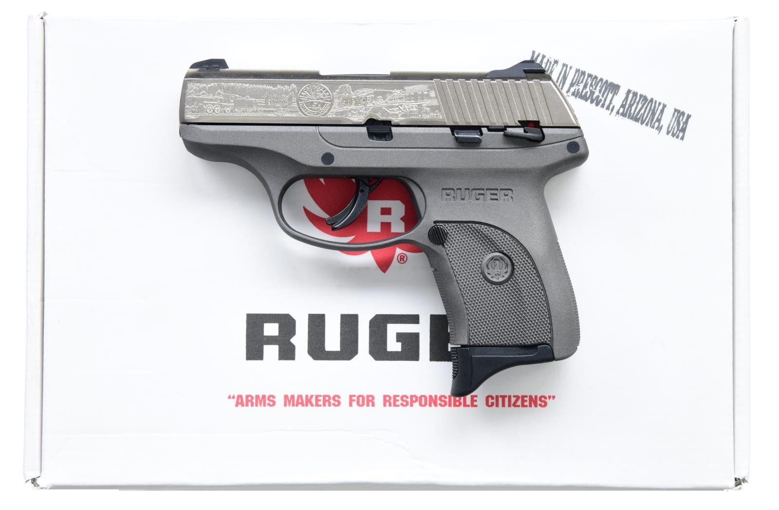 AUTO PISTOL. Cal. 9mm Luger. S# P150-0857. Bbl. 3.12" with black oxide finish. Mfg. 2015 (2014-2017 and 2021) as Model 03238 having catalogue designation LC9S-P150 with engraved matte stainless slide and titanium colored glass filled checkered nylon frame; black controls. Only 1,219 units made. Slide engraved with western scenes plus dates of 1864 and 2014 to commemorate the sesquicentennial of Prescott, AZ which is where the pistol was made. Standard features of striker firing plus 3 safeties: thumb, blade in trigger and magazine. Dovetailed 3 dot black sights with windage adjustable rear. MAGS: 1 factory 7 rd. UNATTACHED ACCESSORIES: matching numbered factory box with packaging to include test fire casing and Ruger marked black nylon pouch. CONDITION: all aspects near excellent; appears new and unfired. (24-6080/NW). MODERN. $500-750.